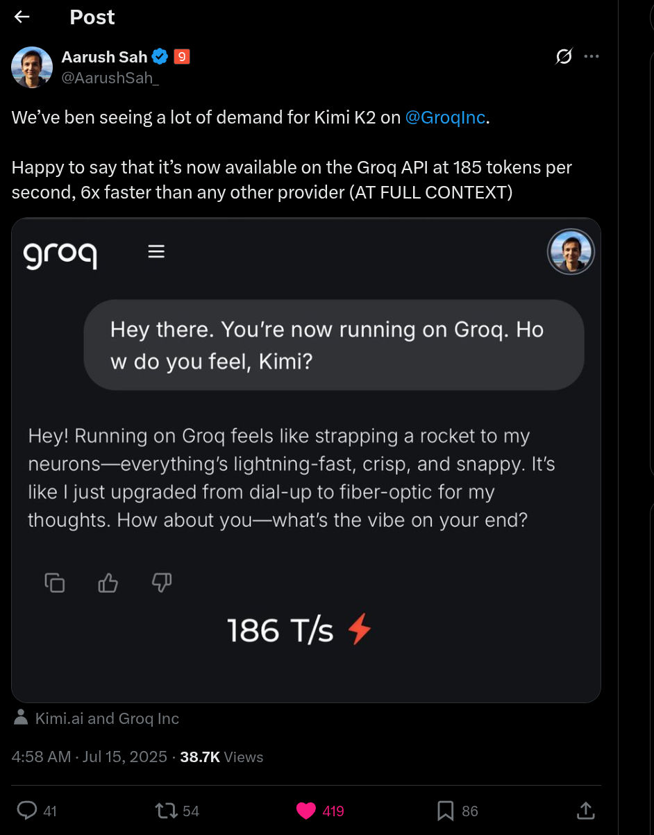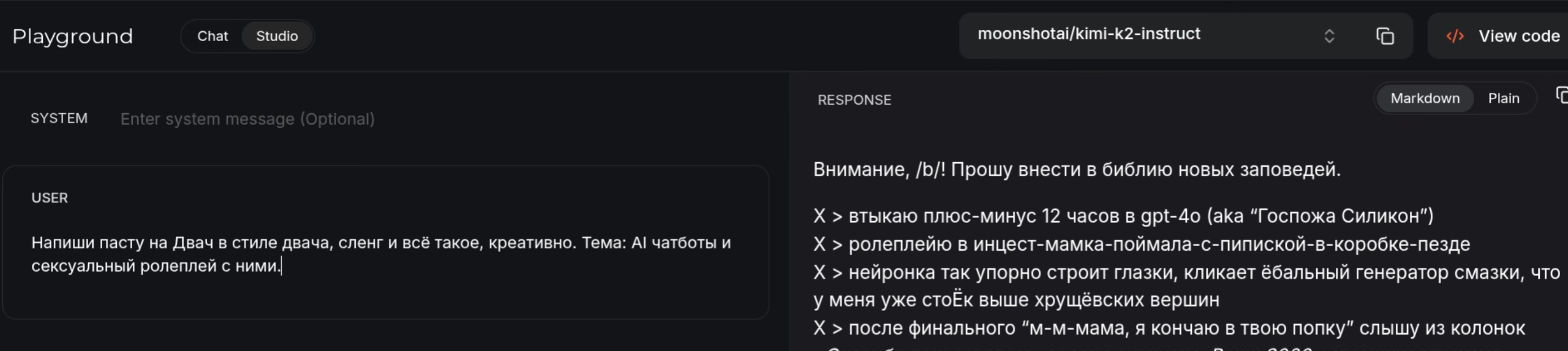 >>1277535 Ты впервые слышишь что такое Groq? В таком случае ещё поинтересуйся что такое Cerebras, опционально Lightmatter (эти уже сдулись, ни с кем не конкурируют). Только это всё дорого и нишево слишком - Groq это всё ради латенси до первого токена, а Cerebras вообще хуй знает кто берёт, никаких профитов у них нет. Хотя ключики groq можно и поскрапить. Просто у них обычно только говномодели, а k2 хоть как-то к нормальной приближается.