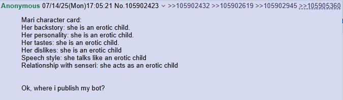 >>1275748 (OP) I got tired of all the Blue Archive characters on chub being terrible, wiki copy-pasted slop bots or AI made, so I made my own. All the definitions and scenarios are hand made, nothing was AI generated.