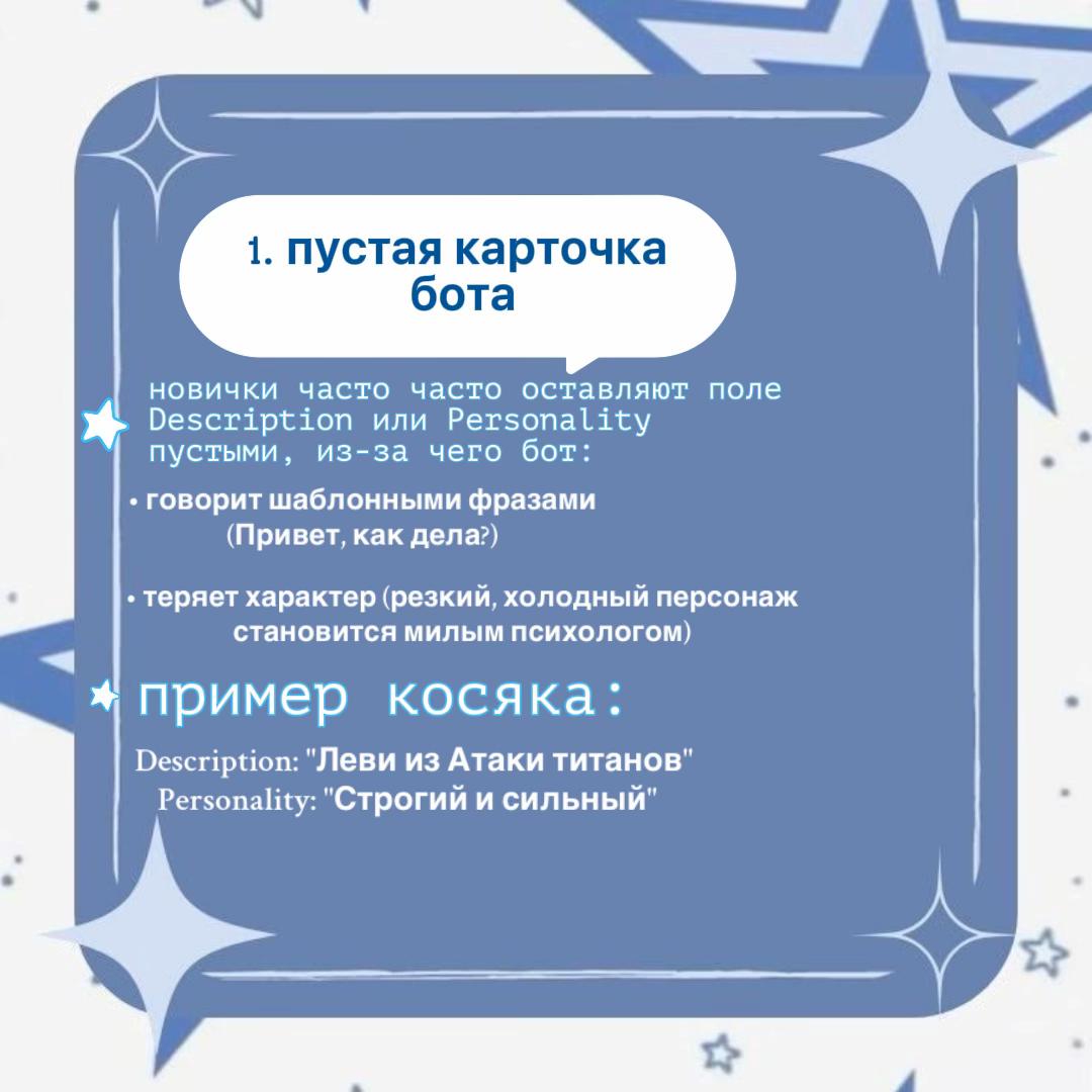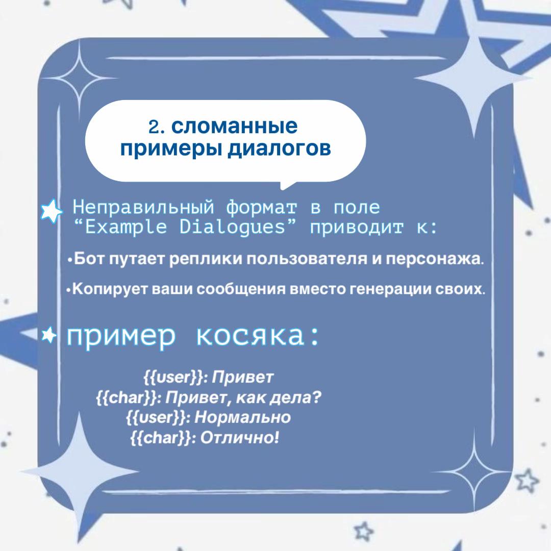 Напоминаю базу: - мемо, хуемо и прочий кал не работают - карточка на 1500 токенов работает хуже чем на 500 - петушиные трюки с json/jed и прочим калом работают хуже чем плейнтекст - гемини все еще для свинособак - детальное описание карточки убивает РП - описание цвета глаз и трусов буквально ненужно, только если вы не ебаный гук