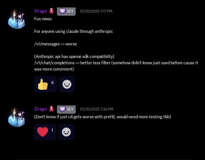 >>1287032 Ну и как я выше написал, я думаю что скорее всего разница мб в анти-nsfw инъектах, может антропики не добавляют их в chat completions на помеченных ключах