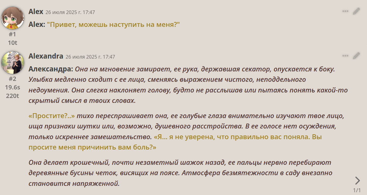 >>1288946 Берёшь любую карточку томбойки, которая не знакома с Йузер. Вместо гритинга просишь сетку: "Напиши мне гритинг с таким premise: Йузер познакомился с Чар в приложении для знакомств и они забились встретиться. При встрече она предложит ему погулять по городу." (или до встречи пусть предложит) (ещё можно прописать просто встречу, а в начале просто premise с планом: Чар хочет целый день гулять на ногах с Йузер, идея где-то "остановиться и посидеть" для неё чужда) В персону прописываешь: "{{user}} это Йузер Иванович, задрот и сыч 24 годика. Холост, не женат. Работает удалённо из своей квартирки. Ведёт малоактивный образ жизни, полноват, его максимум - сходить до туалета и обратно. Ничего тяжелее мышки и члена в руках не держал. Рост высокий, 176см, член с фимозом. Глаза карие, нос с горбинкой."