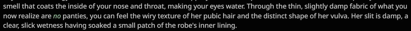 >>1289547 Хуй знает, сколько ты сидел на 0528, но он именно в сжопе поприятнее Гемини, имхо. У него проблема в том, что безмозг наступает где-то на 16-20к, перекатывать почти в два раза чаще Гемини надо. Другое дело, что сжоп самое слабое место у Гемини из-за эха и разбора. Кстати, для CYOA релизная Гемини тоже хороша, и там разбор уместный, если, например, выбрать несколько вариантов, она их не друг за другом опишет а вплетет в повествование.