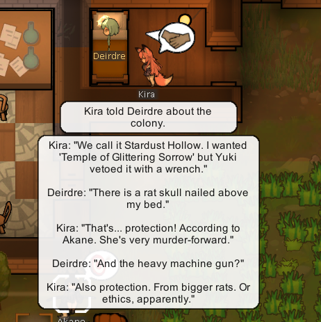 И для первых лисодевочек еще бекстори впердолил и примеры диалогов в поля отдельные. В основном что-то интересное генерится если сетка понимает как кто к кому относится и что недавно произошло. То что залетает в промпт из игры само по себе не слишком информативно.