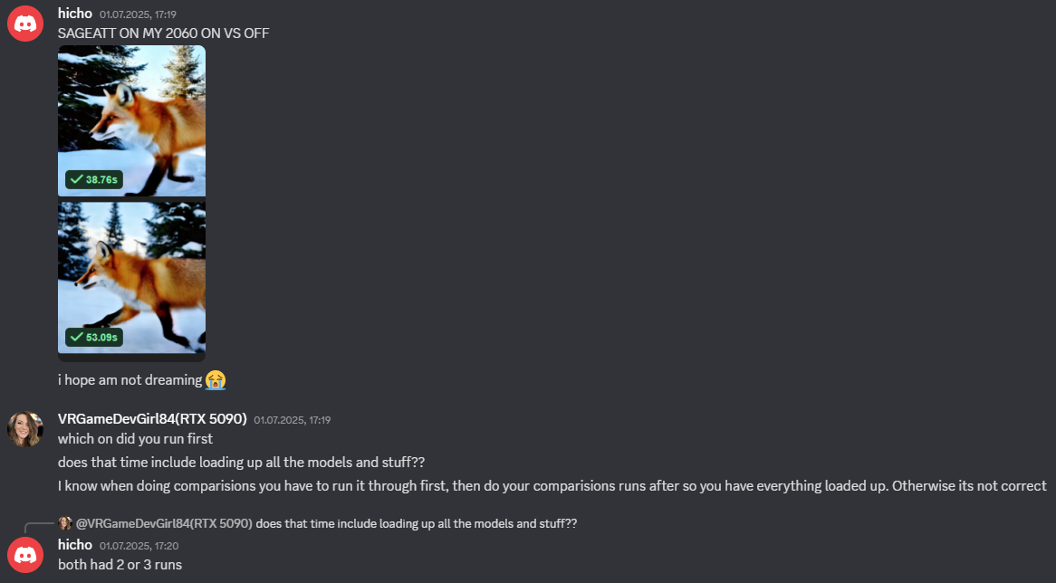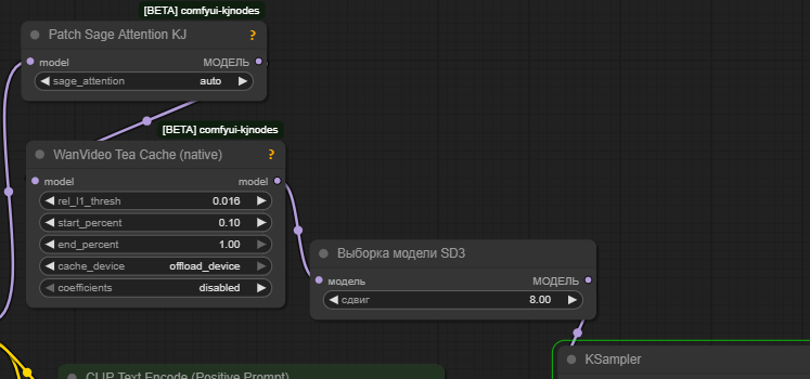 Удалось поставить sageattention на 2060, но разницы в генерации я не вижу. Как было 400 секунд, так и осталось. Я их вставил правильно? После лоры и перед сэмплером.