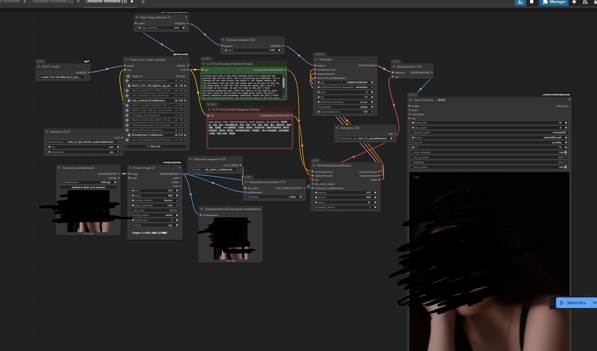 5 сек видео за 280-300 сек с сажей вместо 450-600, класс. Осталось добавить движений. Но когда меняю силу лоры иногда происходит как на пике. А генерация идет вообще за 80 сек, явно что-тог не так. Почему есть идеи? Неправильно ноды подцепил?