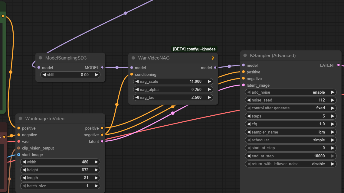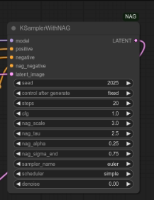 >>1280539 Для нативного воркфлоу лучше юзать ноду из https://github.com/ChenDarYen/ComfyUI-NAG Там есть отдельный KSAMPLER с нагом, там 3 кондишна на вход 1) Позитив (юзаем как обычно) 2) Негатив обычный (Можно хоть пустоту хоть conditioning zero out от позитива взять с cfg 1 там хоть насрать можно, импакт будет нулевой) 3) Наговый негатив, туда уже пишем нормально