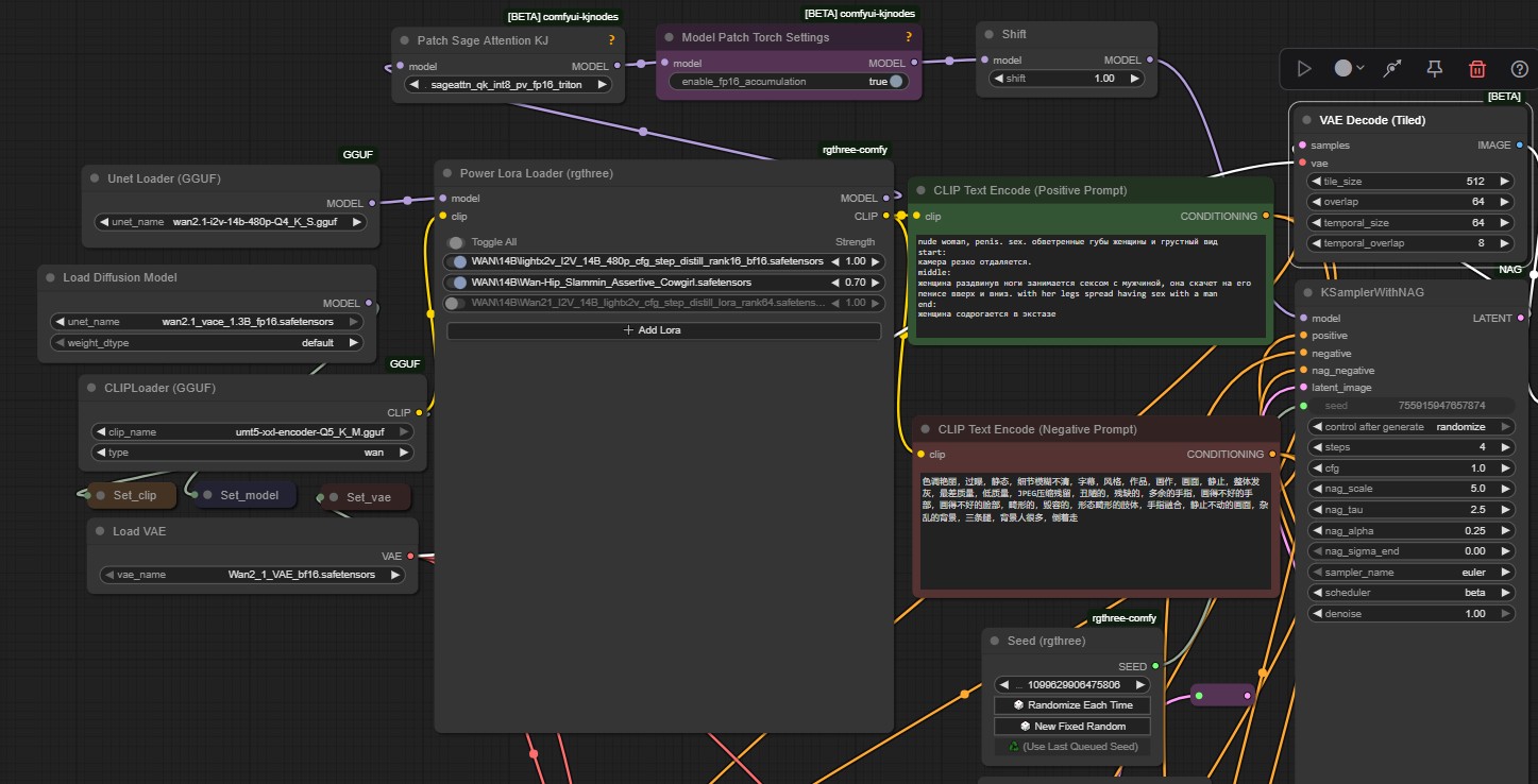>>1285022 Надеюсь на магию оптимизации хотя бы последние два поколения gpu, снижение количества параметров ни в коем случае! И так достаточно дебильных нейронок, пройденный этап >>1285033 Ага конечно, щас корпы себе в репутационный убыток сделают модель, что сможет в «женщина лежит на траве» и попадет под все анальные кары, просто так чтобы было >>1285051 Если ты юзаешь lightx2v с cfg 1 без NAG - в негатив можешь даже насрать, разницы не будет никакой, у меня он вообще отрублен через conditioning zero out