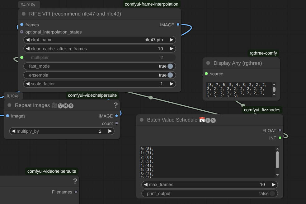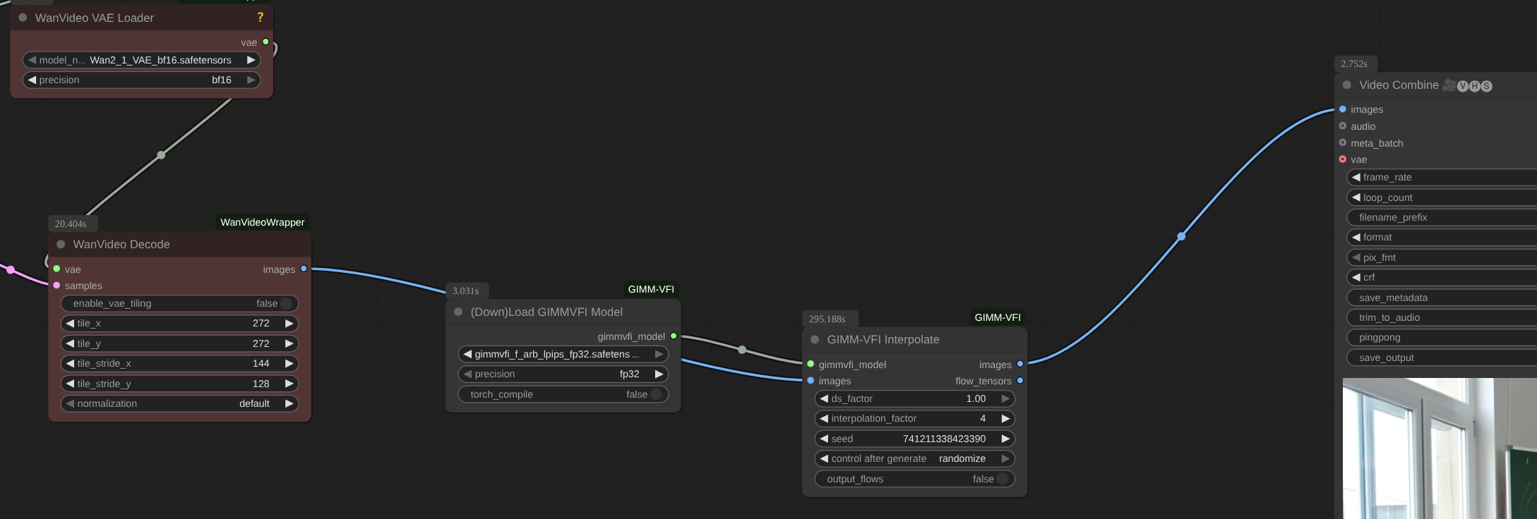 >>1286549 >>1286582 Вся интерполяция идет не от видео, а от кадров. На workflow ее ставят перед сборкой видео - пока на выходе после рендера еще отдельные кадры, так что ничего руками брать не надо - просто скармливается выход WAN рендера после vae decode - там пока еще только куча картинок а не видео. Интерполяция достраивает кадры между ними. И только потом все собирается в видео.