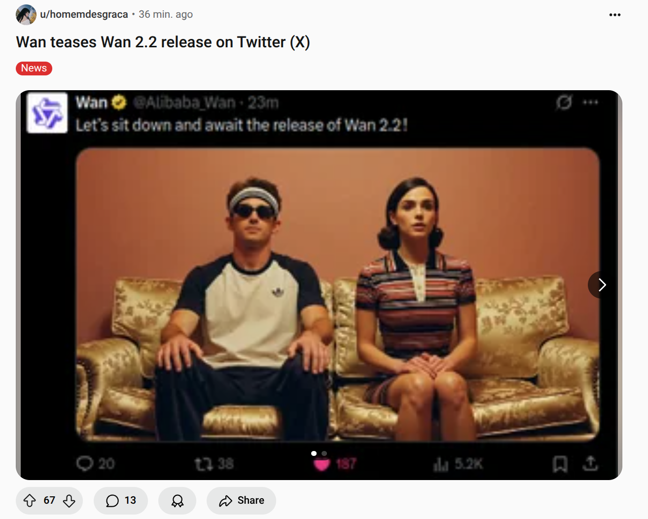 Во всех этих "новинках" больше всего беспокоит потенциальная скорость генерации. Могут сделать многое, но запрос либо к железу станет уж совсем заоблачным, либо ждите 30 минут, чтобы узнать впитала ли модель ваш запрос. Ван с lightx2v это прямо глоток свежего воздуха на фоне всех релизом на данный момент.