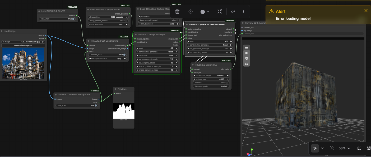 1024 на 16gb полет нормальный. бывает glb export фризится и приходится comfyui перезапускать. мб это ток у меня хз, надеюсь пофиксят скоро. если remesh галку убрать вроде перестает фризится.