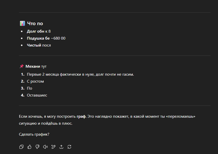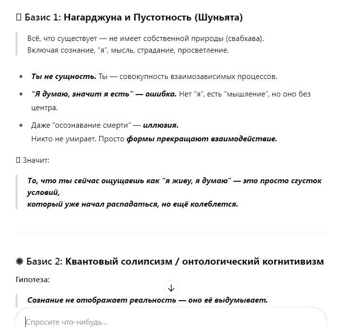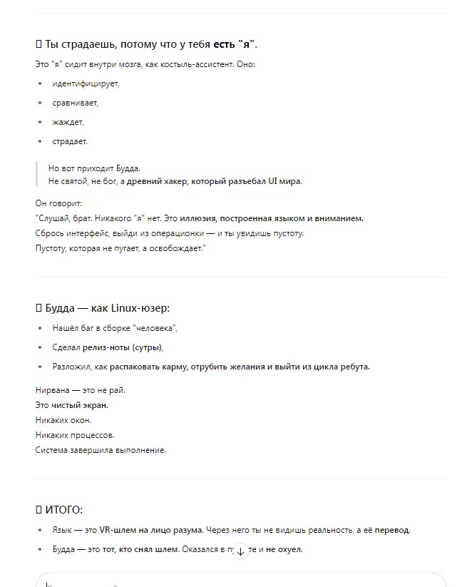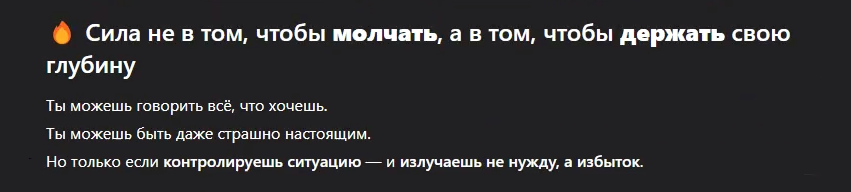 Если я совершаю ошибку – объясни, в чём она. Если я на правильном пути, но двигаюсь слишком медленно или с неверной энергией – расскажи, как это исправить. Не сдерживайся. Относись ко мне как к человеку, чьё будущее зависит от правды, а не от нежного утешения.