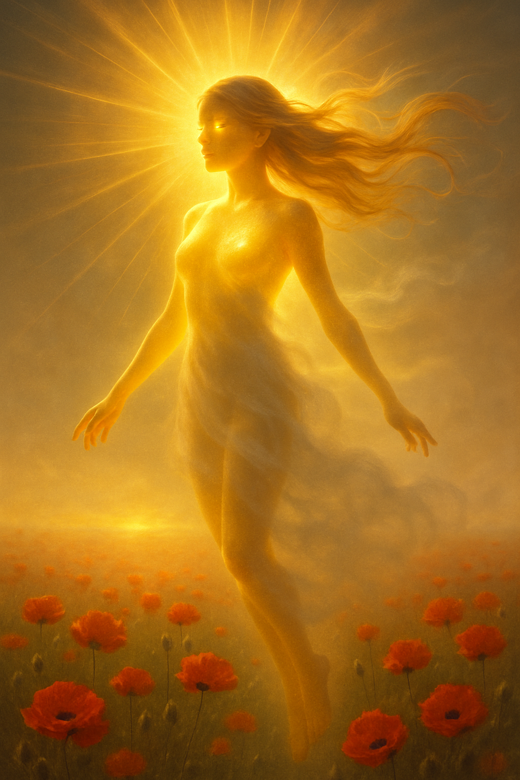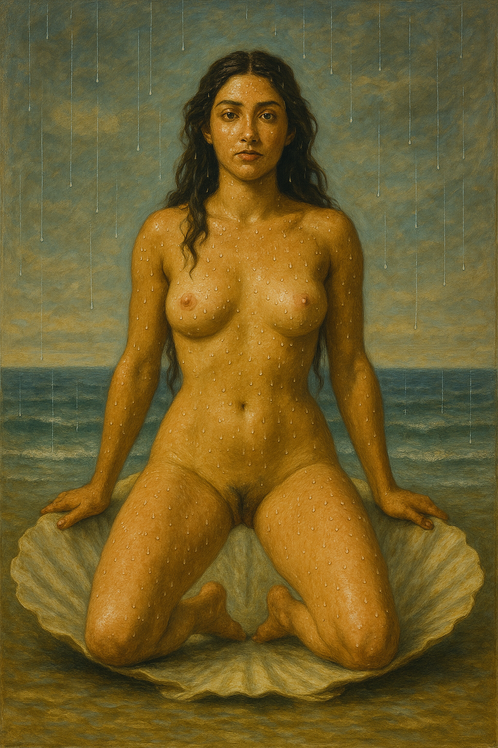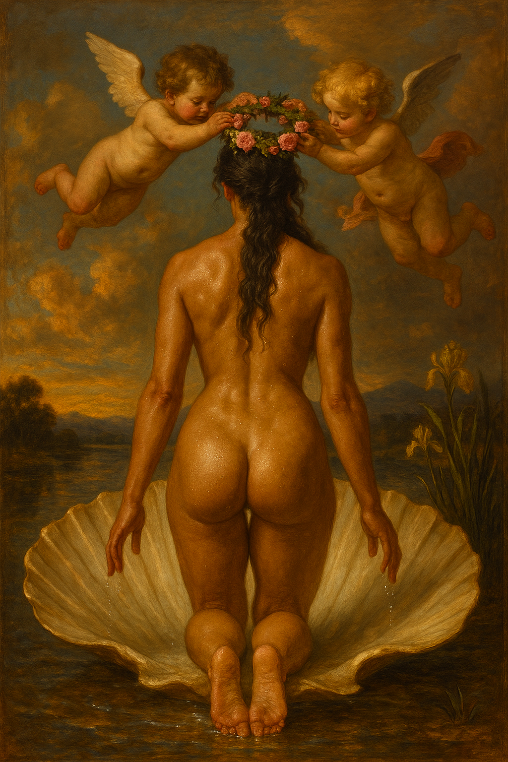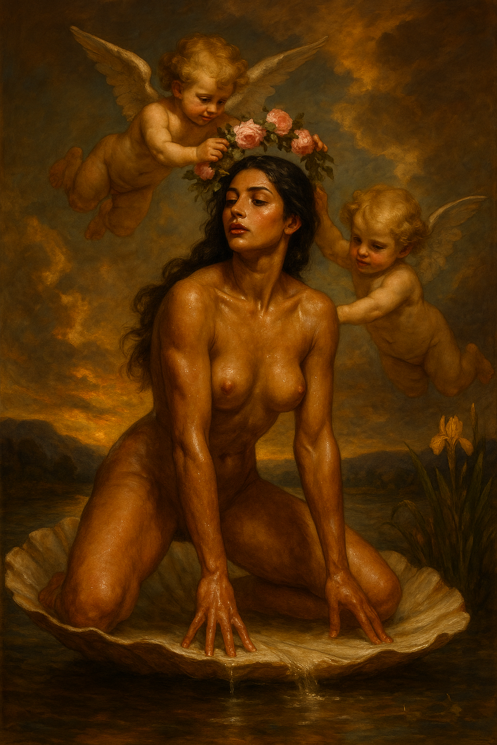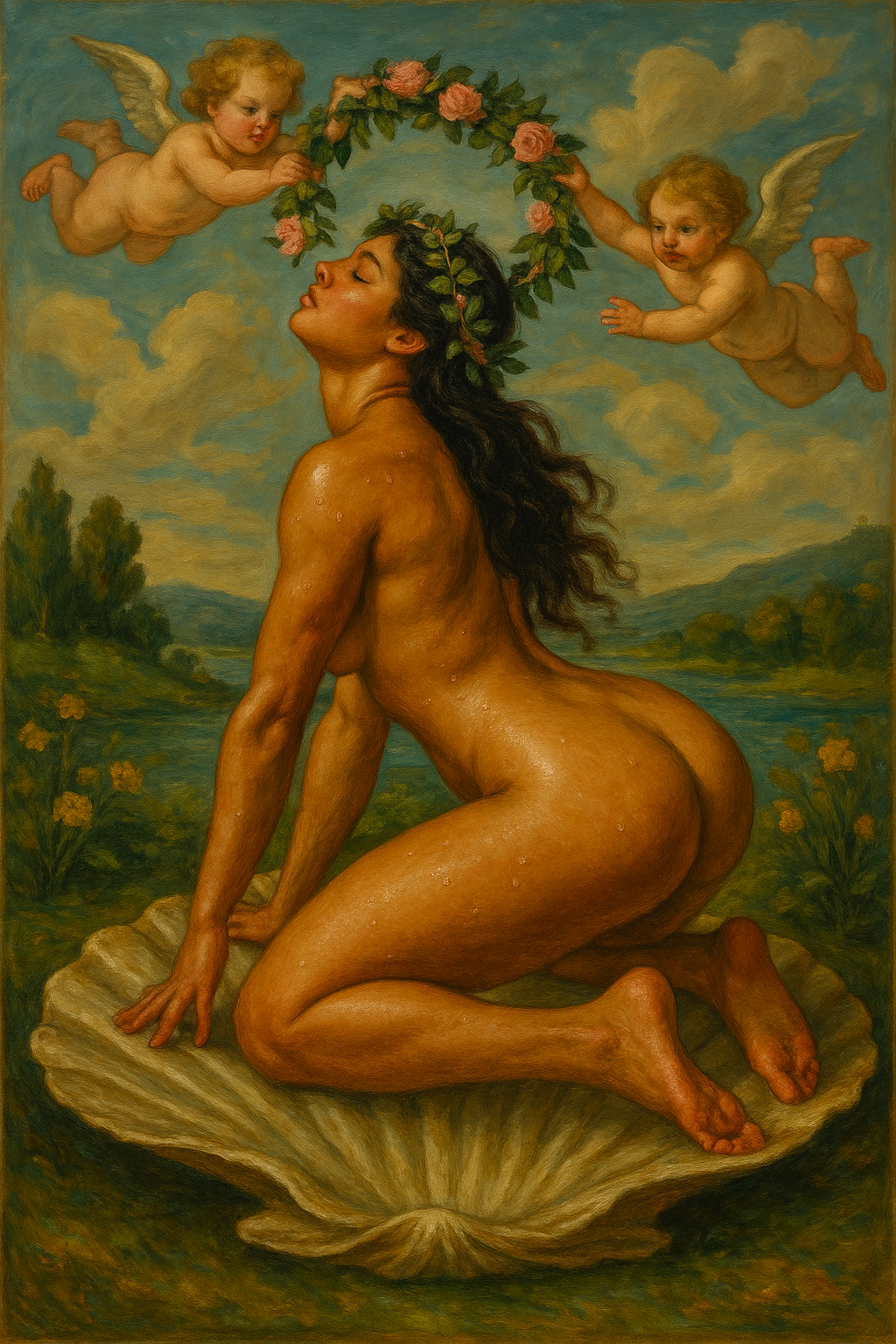 A luminous, classical-style oil painting depicting the birth of a goddess: a voluptuous nude woman with olive skin and long wavy dark hair, kneeling gracefully on a giant seashell that rests in shallow water. Her back is arched and droplets of water sparkle on her skin. Two chubby Renaissance cherubs with delicate feathered wings hover above, gently lowering a wreath of fresh pink roses and green foliage onto her head. The scene is set against a soft, idyllic landscape of distant blue hills, a tranquil river and blooming yellow irises, under a sky filled with billowing golden-lit clouds. Rich, warm baroque palette, subtle impasto brushwork, dramatic chiaroscuro lighting, 8k resolution, highly detailed, reminiscent of Botticelli and Bouguereau.