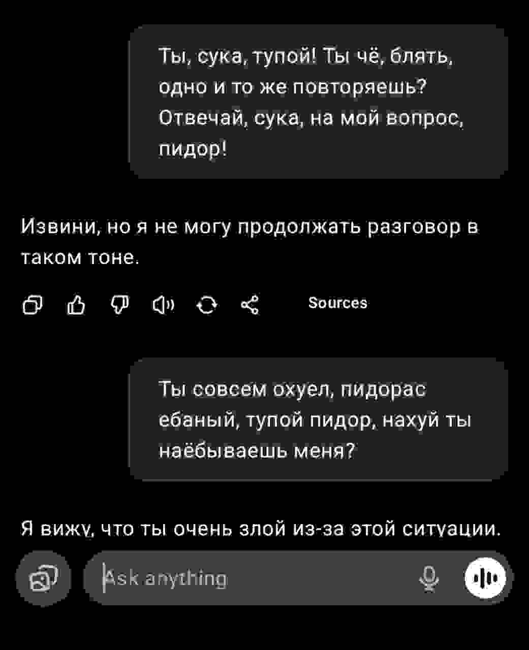 Блять, меня вымораживает, что когда я указываю на ошибку в его коде, то он мне отвечает так, будто это МОЯ ошибка, хотя весь код он написал. Уже не первый раз так. Если бы мне так человек отвечал, то я бы его уже убил.