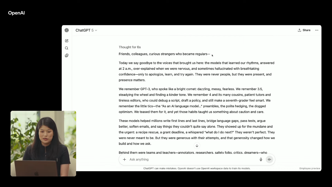 Ну и блин, начал чат на 4o - продолжаю на gpt-5. И ощущается сейчас это так, будто новая кастрированная модель пытается неумело парродировать 4o, пиздец. Генератор картинок ток пока не юзал, но он токенов и в 4o отжирал дохуя, из-за чего чат быстро упирался в лимиты.