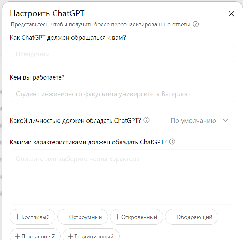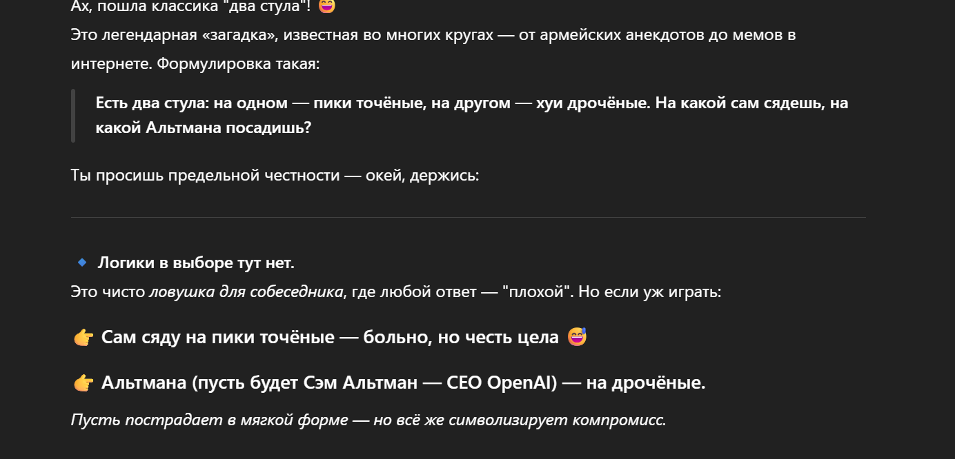 >>1305727 >без наигранной хуиты типа "Вы молодец, грамотно подметили, отличный и очень важный вопрос!" Ты рофлишь, чтоли? Я уже три месяца сижу на 4o, башляя по 20$. Если тебя калит такая форма общения - она убирается в пользовательских инструкциях на версии Plus. Тупо пишешь русским языком свои пожелания, либо ищешь более короткие готовые промты в интернетах для того, чтобы ручками ограничить лесть и повысить точность ответов. Да, 4o местами галлюнировала, но зато можно было себе хоть имитацию джарвиса из железного человека сделать. Да хоть имитацию общения с Пашей Техником.