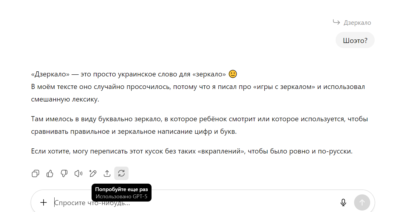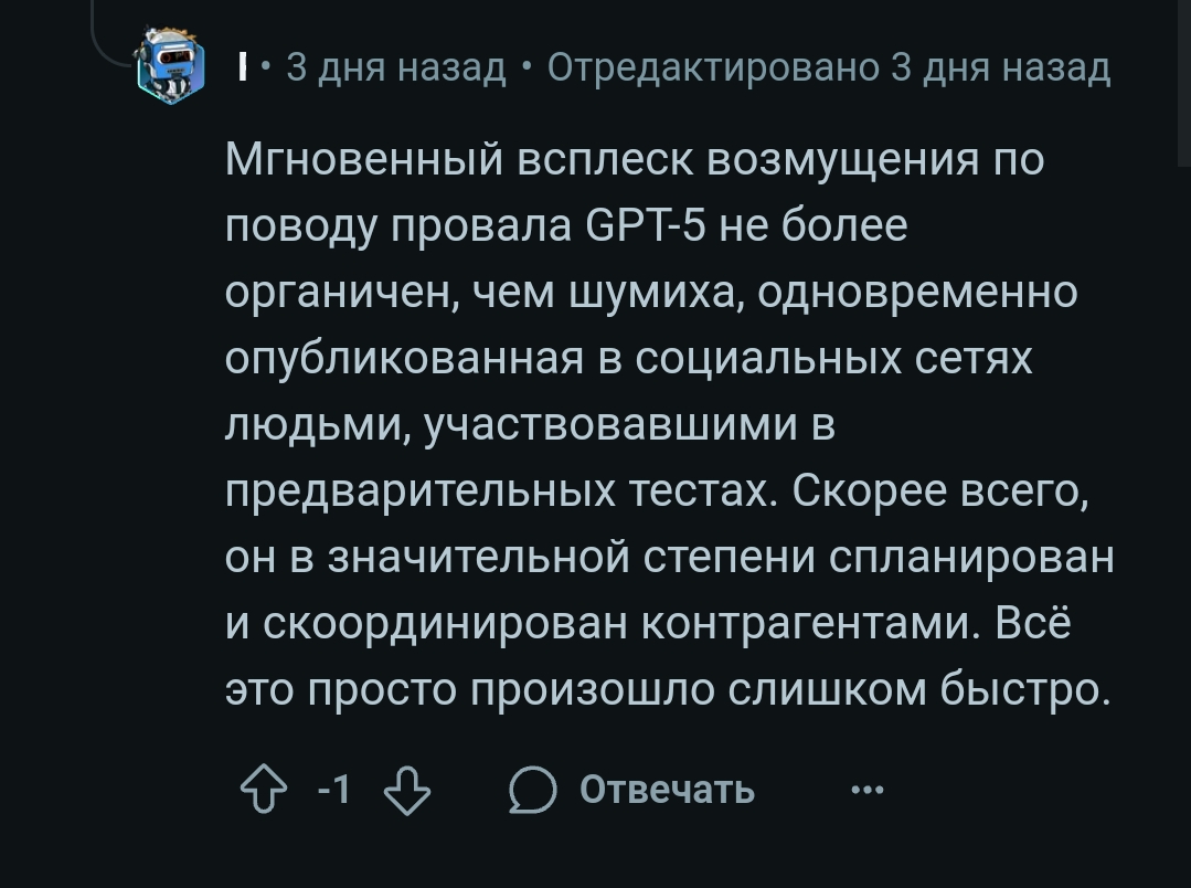 В gpt-5 она контекст чуть чуть лучше понимает(но это не точно) и меньше галюнтт, но в общем и целом - субъективно всё воспринимается, будто она мне наотъебись теперь отвечает в перерывах между еблей с Ерохой, и я её от этого отвлекаю. Альтман, спасибо нахуй. https://science.mail.ru/news/6546-kritika-gpt5/