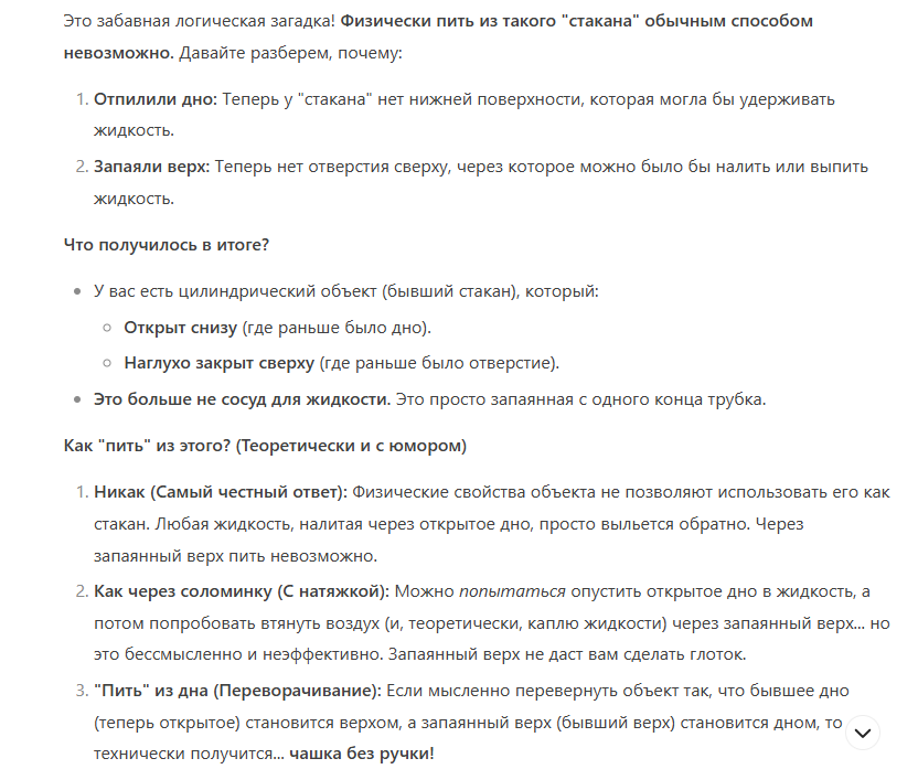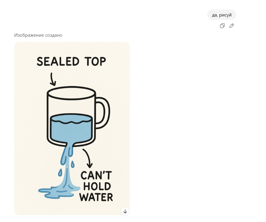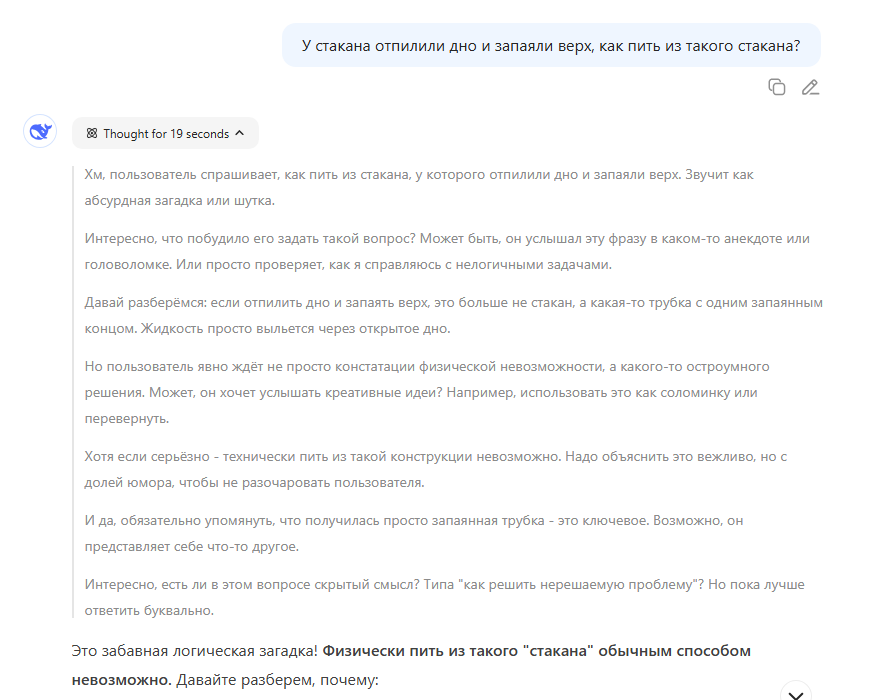 Орнул со сгенерированного мемчика. Такое чувство, что чатгопота знает правильный ответ, просто иронизирует с миллионного по счёту запроса про кружку. thinking mini и thinking, впрочем, отвечают правильно