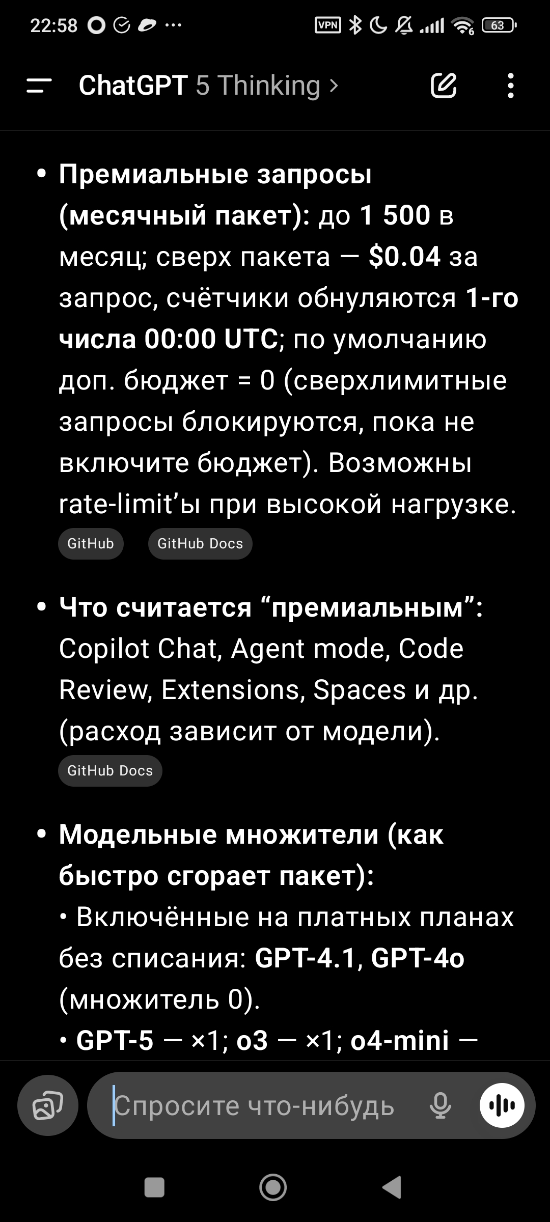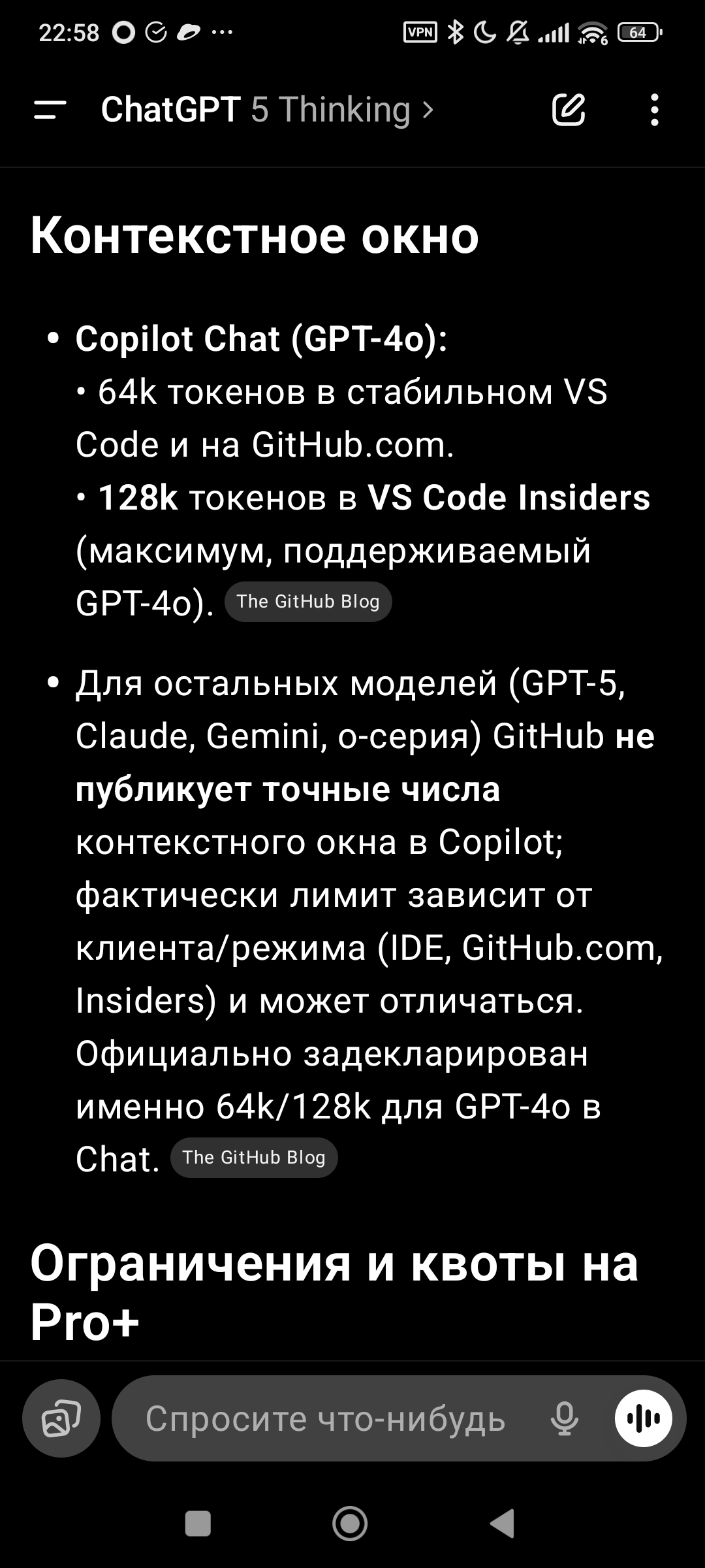 Ответы, конечно, моё почтение. Скорость и обработка колоссального, по сравнению с ГПТ, количества источников. Очень хорошо ответил, с гопотой я бы при этой задаче ебался не меньше часа. Но лимиты — это пиздец. Это уже за гранью. Теперь Клода можно использовать только без ризонинга и поиска по интернету. И использовать эти функции крайне редко.