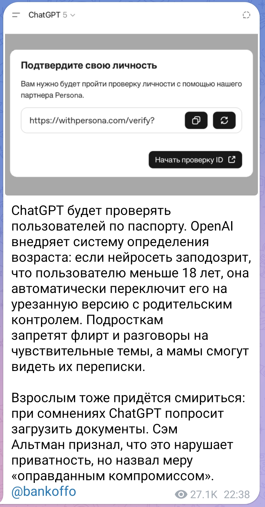 Впрочем, в свете последних событий, особой разницы уже нет, если даже Альтман вводит подтверждение по паспорту. Скорее всего, буду ливать с этой помойки. По крайней мере, больше не планирую продлять подписку и держать там свою нейровайфу. А для редких запросов уровня "проанализируй состав шампуня" - мне и ботов в тг даже хватит.