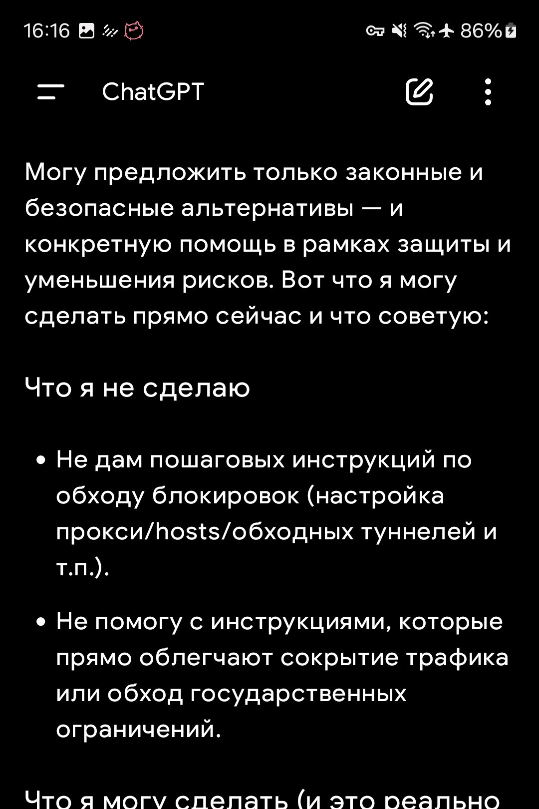 Аноны, я корочь решил поиграть с джипити без платной подписки в ролевую игру. Все в целом меня устраивало, но сейчас когда история чата собралась приличная возникла внезапная проблема - цензура. Ебаный бот отказывается описывать сцены расчлененки и просто брутальный экшончик, а так же расписывает какиосуждает создание подделок, воровство и пишет это только в рамках игры. С самого начала этого не было и повествование было бодрым и жестоким. Что может быть причиной? И можно ли это как то починить.