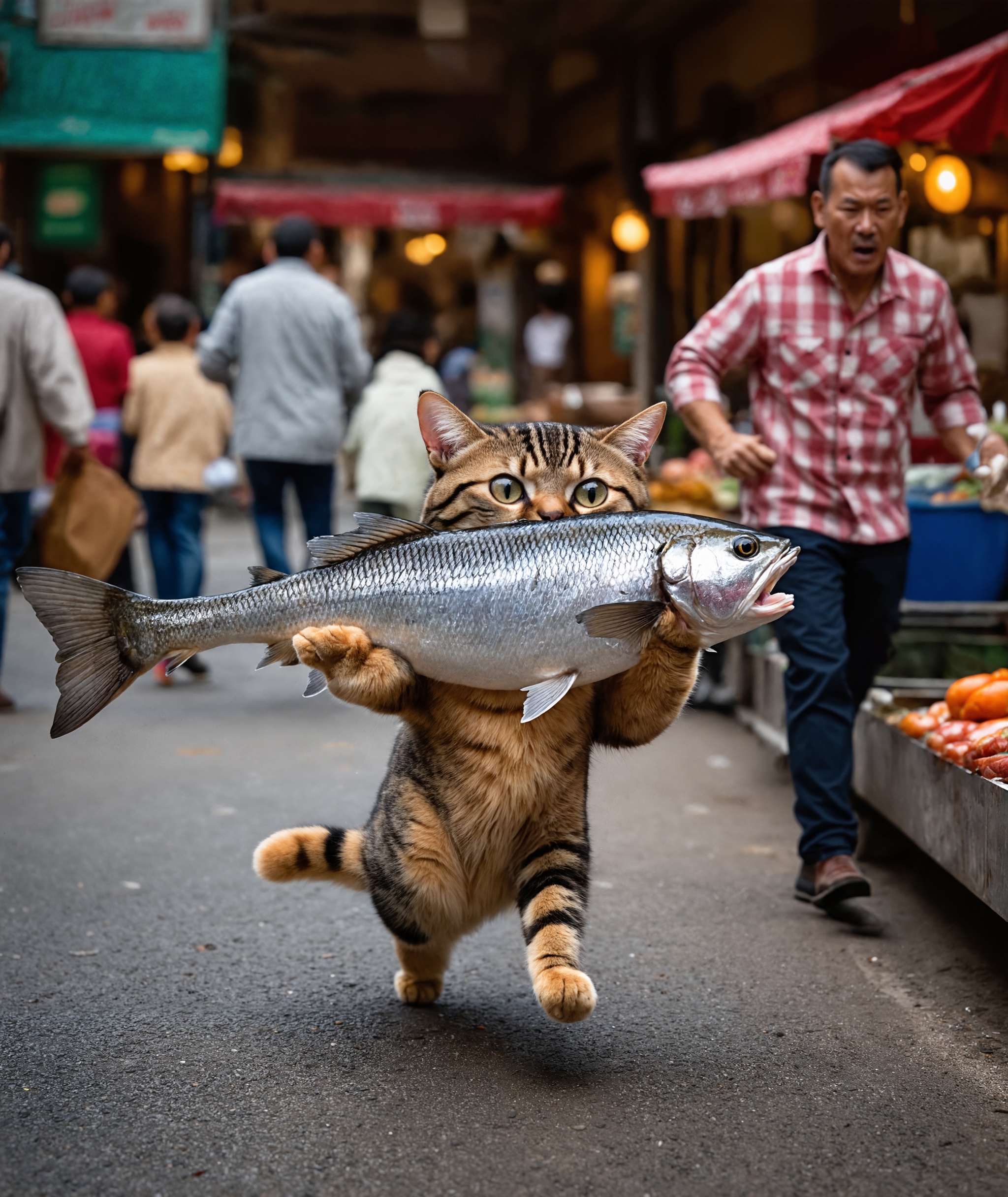 >>1291635 A chibi cat has just stolen a fish in a fishmonger's shop and runs away on its hind legs holding the fish in its front paws. He has a comical panicked look on his face because he is being chased by the fishmonger man. The fish appears to be silver and of medium size. In the background, the fishmonger yells at the cat. The scene is the street of an open-air market, with stalls and people strolling. photo, soaked film, 4k, 8k ,uhd.
