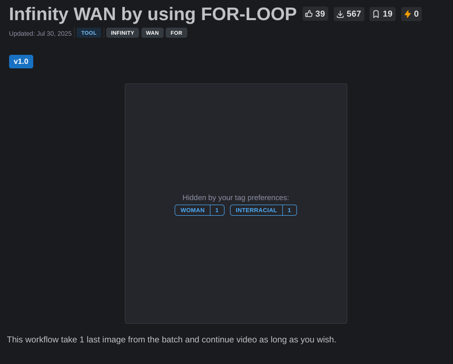 нашел на civitai воркфлоу на автоматическое продолжение генерации видео с последнего сгенерированного кадра предыдущего видео с возможность задать количество поочередных этапов генерации.