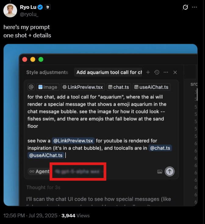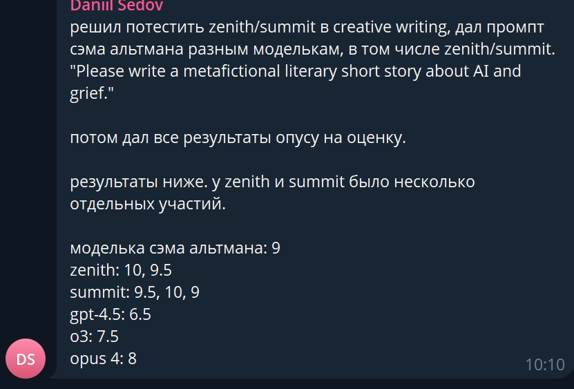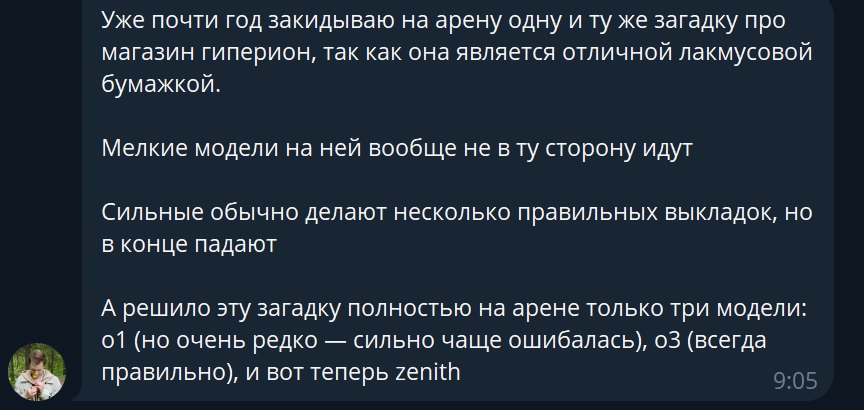 На LLMарене появилась очень умная загадочная модель под названием zenith, пользователи подозревают, что это GPT-5, уж слишком умна в логическом мышлении. Одновременно с этим, на другой арене, а именно на веб арене, появилась модель под названием lobster, и пользователи думают, что это тот же zenith, то есть GPT-5. Lobster кодит круче, чем o3-alpha-responses-2025-07-17 которую недавно тестировали на арене, и от которой все ссались кипятком. Ещё на LLMарене появилась модель summit, пользователи думают, что это может быть одна из вариаций GPT-5, так как мы уже знаем, что модельку выпустят в трёх вариантах: GPT-5, GPT-5-mini, и GPT-5-nano (и возможно GPT-5 Pro). Возможно OpenAI тестирует именно мини-версии своих моделей, так как по знаниям они ушли недалеко от GPT-4.5 и GPT-4.1, но по логическому мышлению zenith сейчас топ 1. Опять же, судя по отзывам юзеров. Так что относимся к этой инфе с осторожностью.