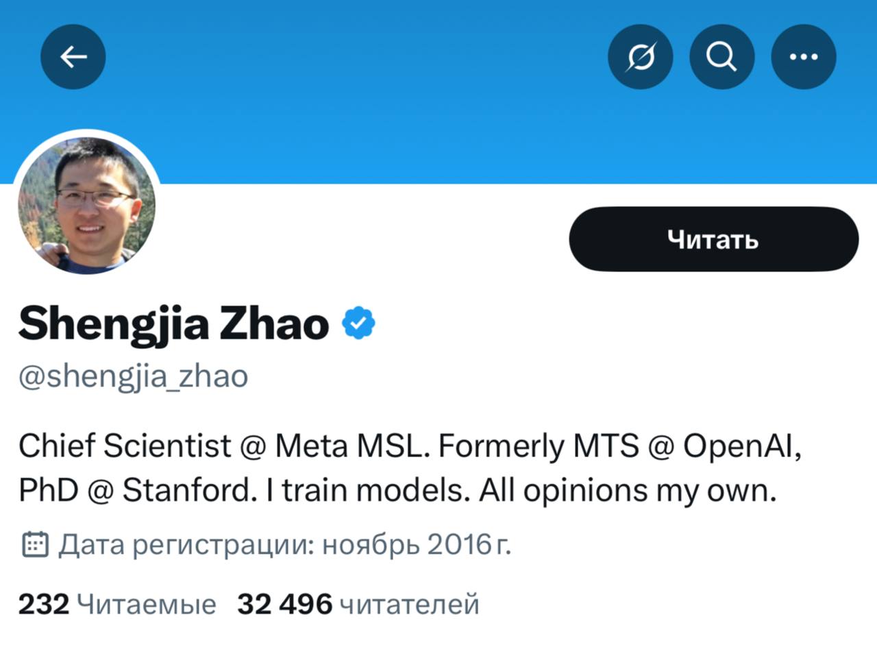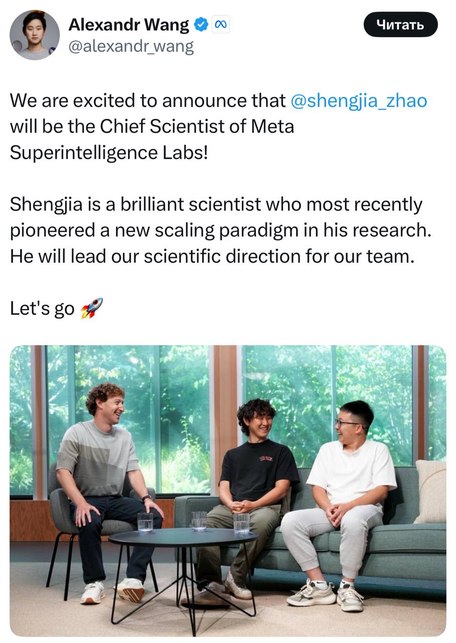Им станет Shengjia Zhao, который пришел из OpenAI. Там он работал над обучением GPT-4, o1, o3, GPT-4.1 и других моделей, а также возглавлял направление synthetic data.