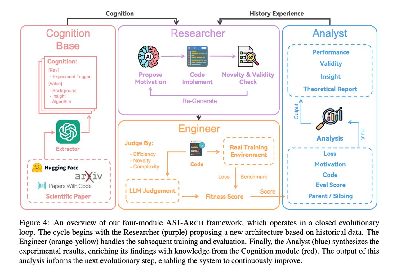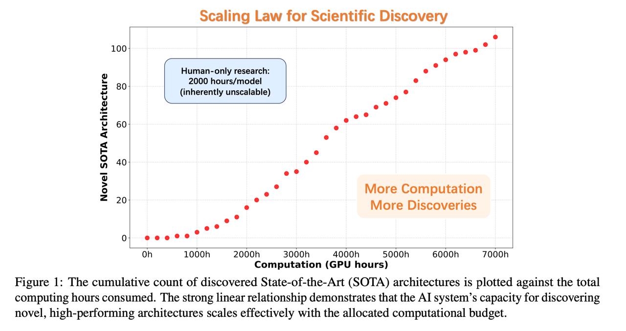 Авторы представляют ASI‑Arch — первую систему класса ASI‑4AI (Artificial Superintelligence for AI research), которая способна автономно генерировать, программировать, обучать и анализировать новые архитектуры нейросетей (в частности линейное внимание). В 1773 экспериментaх на 20000 GPU‑часов было создано 106 принципиально новых архитектур, превосходящих человеческие аналогичные модели. По аналогии с «ходом 37» AlphaGo, они демонстрируют неожиданные инсайты дизайна. И, что важно, авторы формулируют scaling‑law для научного открытия: прирост открытий растёт линейно с вычислительным ресурсом, а не человеческим временем arXiv+1arXiv+1 .