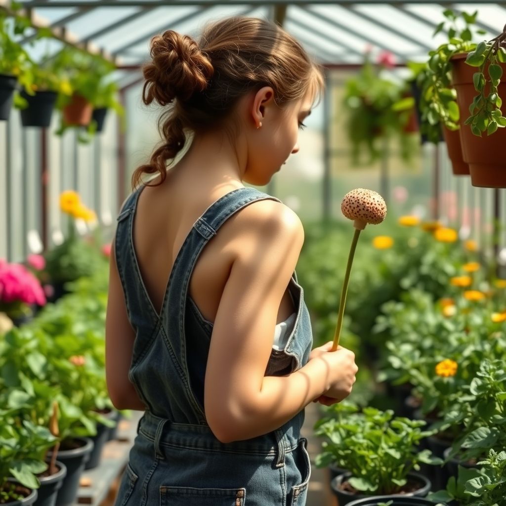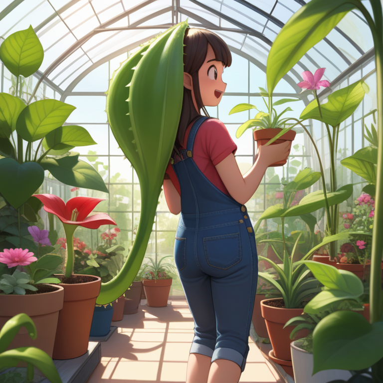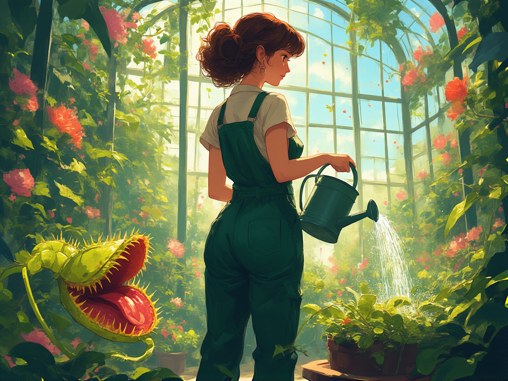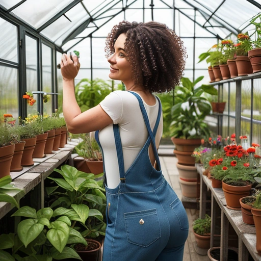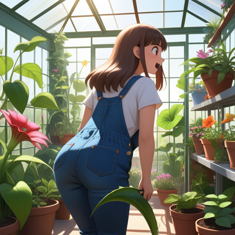 В оранжерее, солнечно, милая фигуристая девушка в комбинезоне, поливает вьющиеся и цветущие растения, в горшках. Мы видим её со спины. Лицо в профиль или отвёрнуто от зрителя.