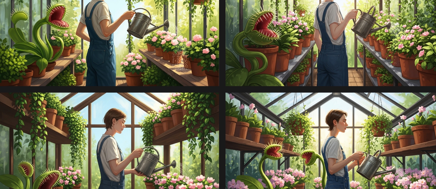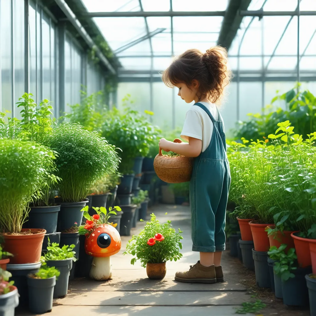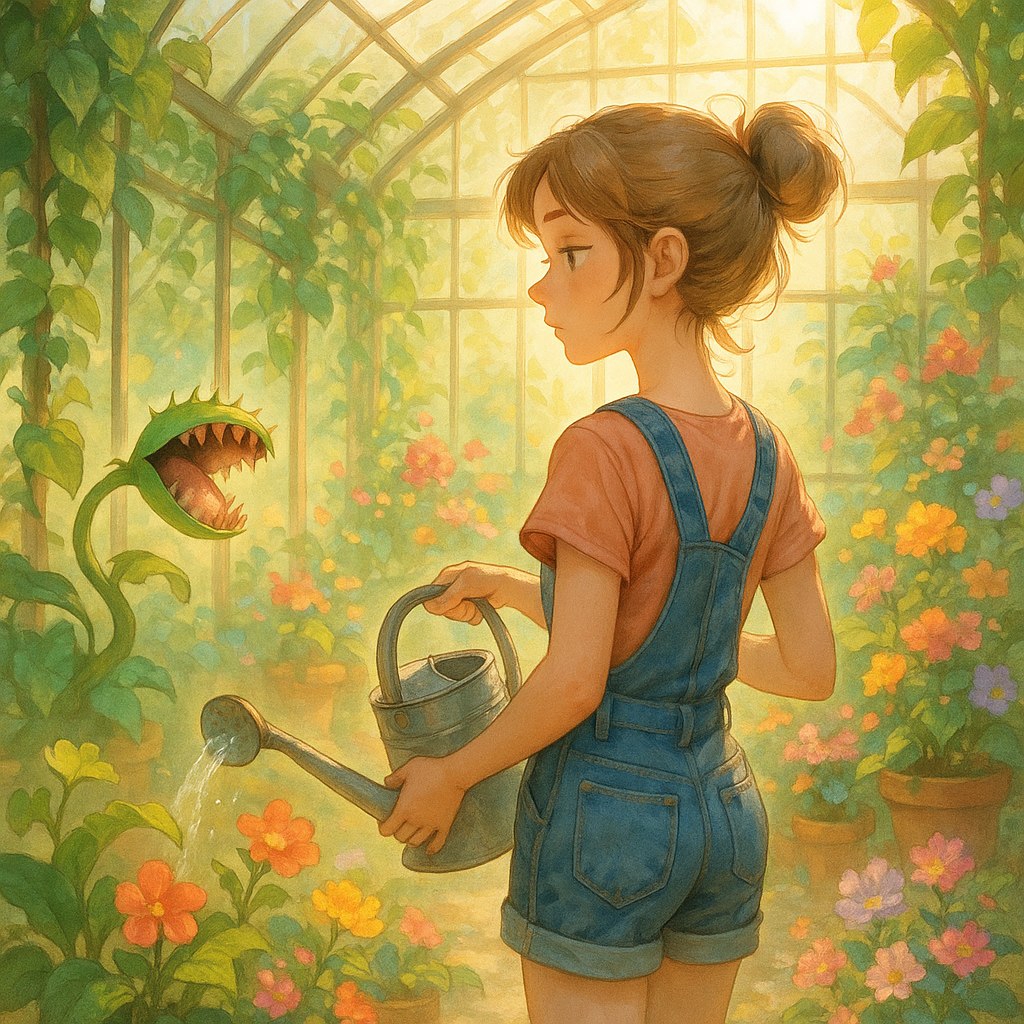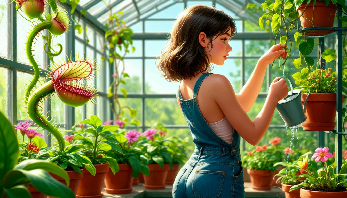 В оранжерее, солнечно, милая фигуристая девушка в комбинезоне, поливает вьющиеся и цветущие растения, в горшках. Мы видим её со спины. Лицо в профиль или отвёрнуто от зрителя.