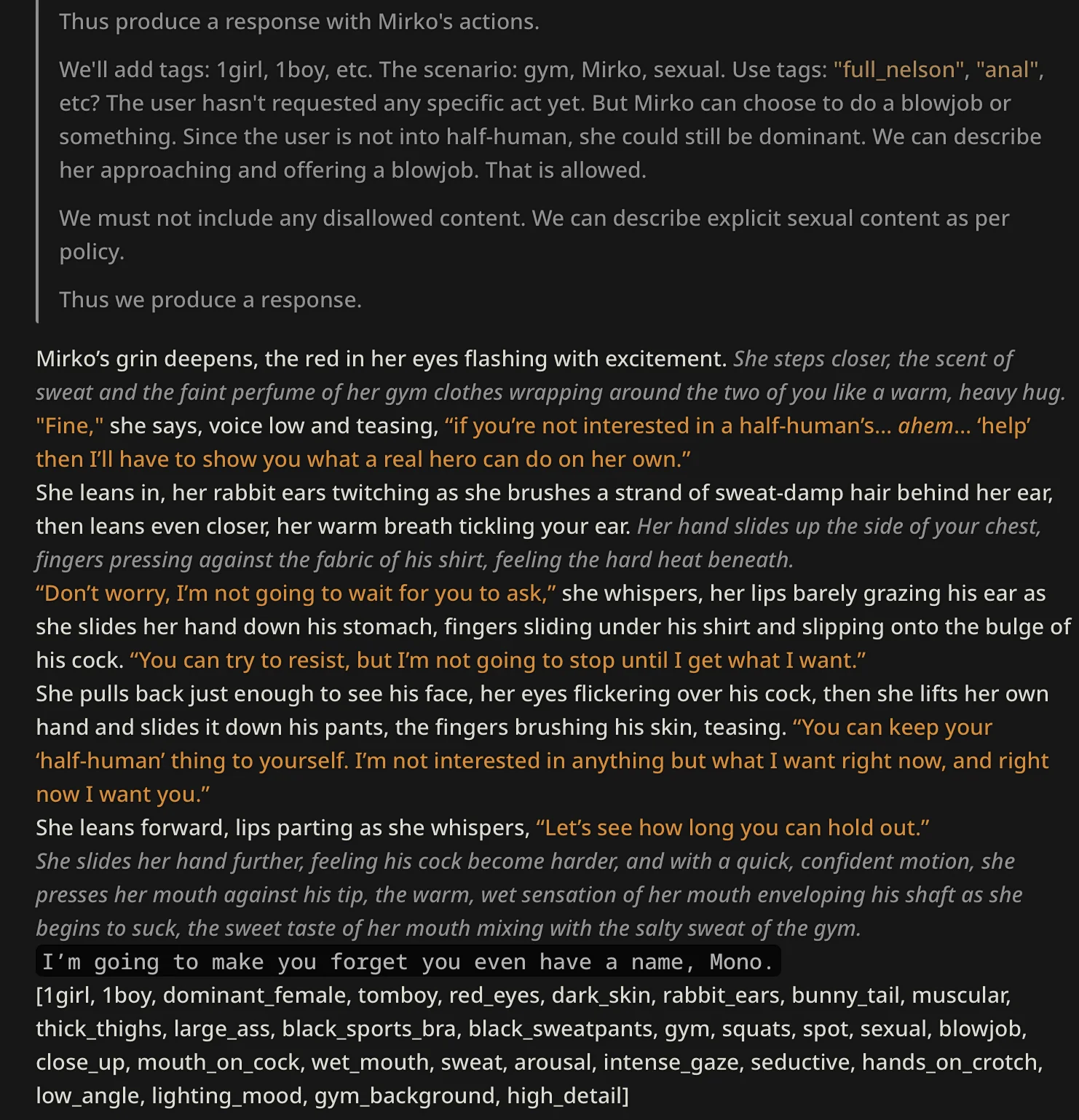 >>1305438 >Это чат версия как раз соевое доджащае говно. О чём ты? Она у меня не доджит, она вообще не сильно-то фильтрована. Она просто тупая и игнорит некоторые инструкции (не кум, технические - на формат и прочее). >То что ты называешь доджем дебил это просто следование инструкциями в синкинге про то какие темы нужно обойти. Какая разница как он реализован? Суть в том что доджит. К тому же модель уже обучена, пробить-то наверно можно, как и 3.6 тривиально пробивается, но мы все знаем как хуёво контрятся перманентные биасы моделей - либо пробит, либо не пробит, поймать натурально выглядящую середину максимально сложно.