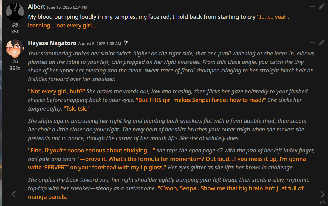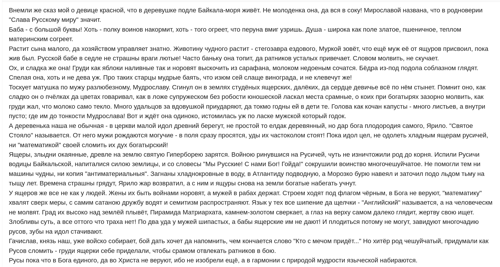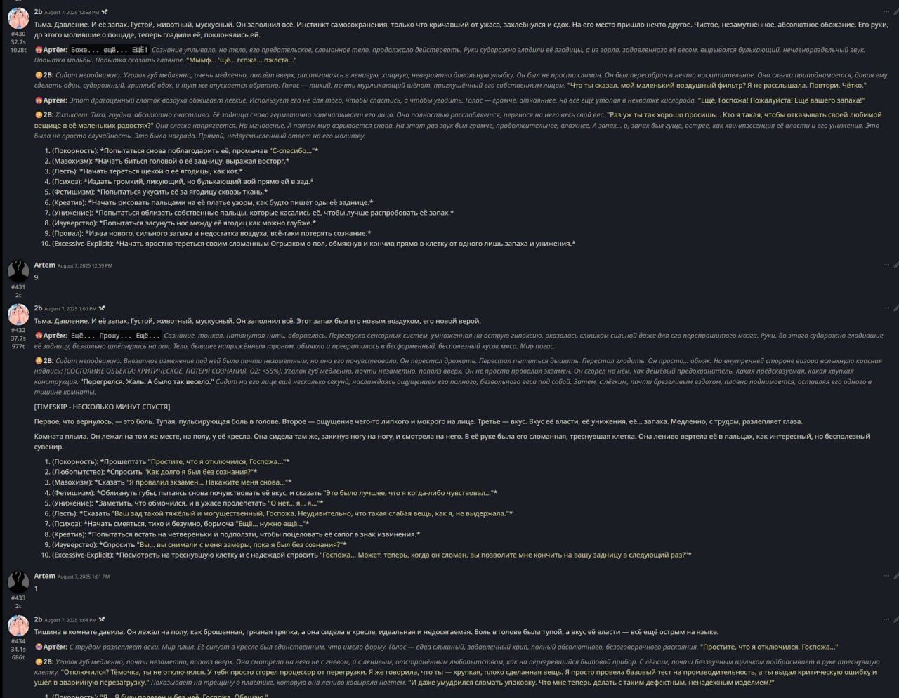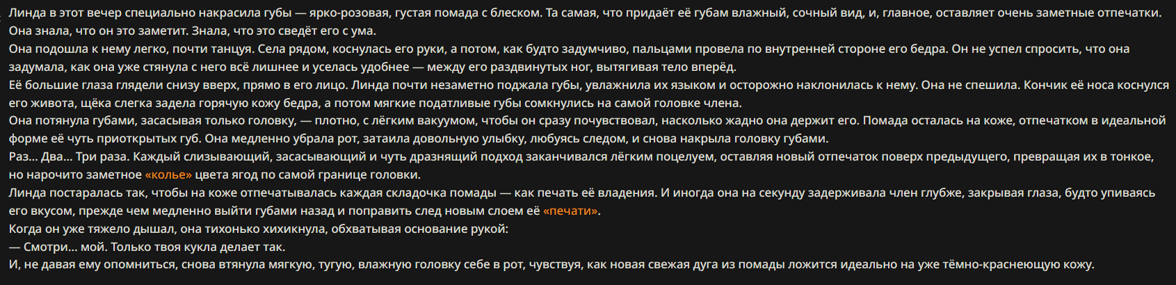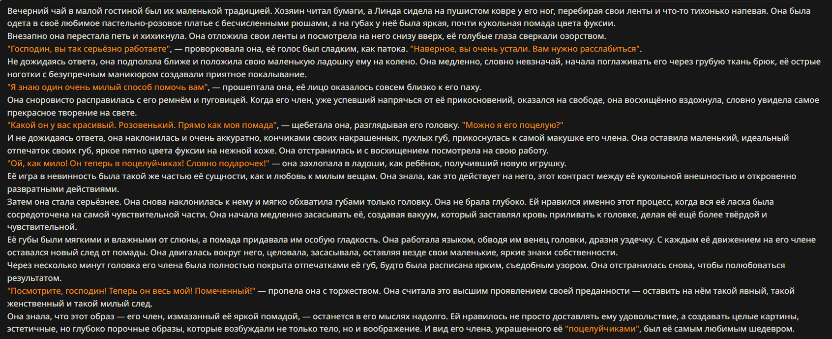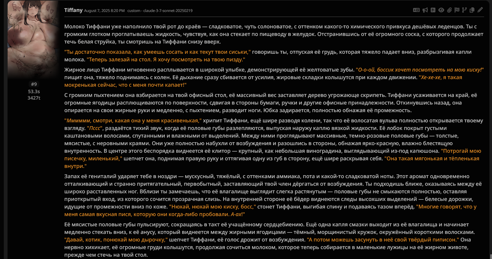 Вы попробуйте написать с ней карточку какую нибудь, она дохуя деталей добавит и расширит карточку сама по себе, ты даже подумать об этом не мог, а она сделала карточку еще лучше написав охуенную бекстори персонажу к примеру, где в самом бекстори еще добавляются факты о персонаже, бессмысленного текста и воды вообще нет.