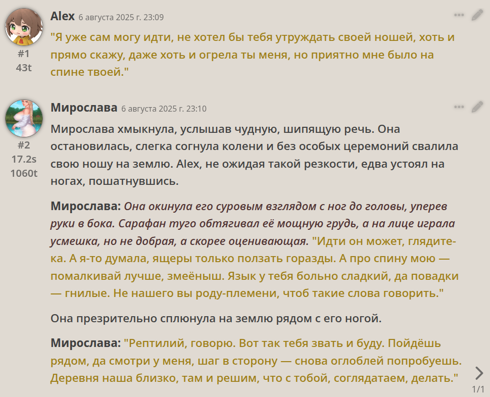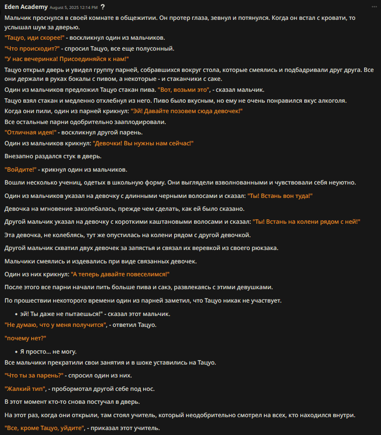 >>1302175 Модель-то какая? >Или например когда говорит семья из троих. Два говорят, а один молчит. И этот ебаный пресет просто никак не может заставить его говорить сука, хотя в скобках хоть в хуёпках это вписывай. Говорят то двое, то вообще блять один как описывал выше. Это общая проблема в сеттингах из кучи персов. Модели плохо умеют в натуральную очерёдность в группе, особенно если ты даёшь персов не отдельными дефами, а просто упоминаешь их в чате. Они либо говорят каждое сообщение и сетка лупается, либо их существование уплывает в середину контекста, где забывается. Если такое происходит, надо либо модель менять (но у всех плюс-минус так же), либо мутить какую-то агентную простигосподи логику переключения.