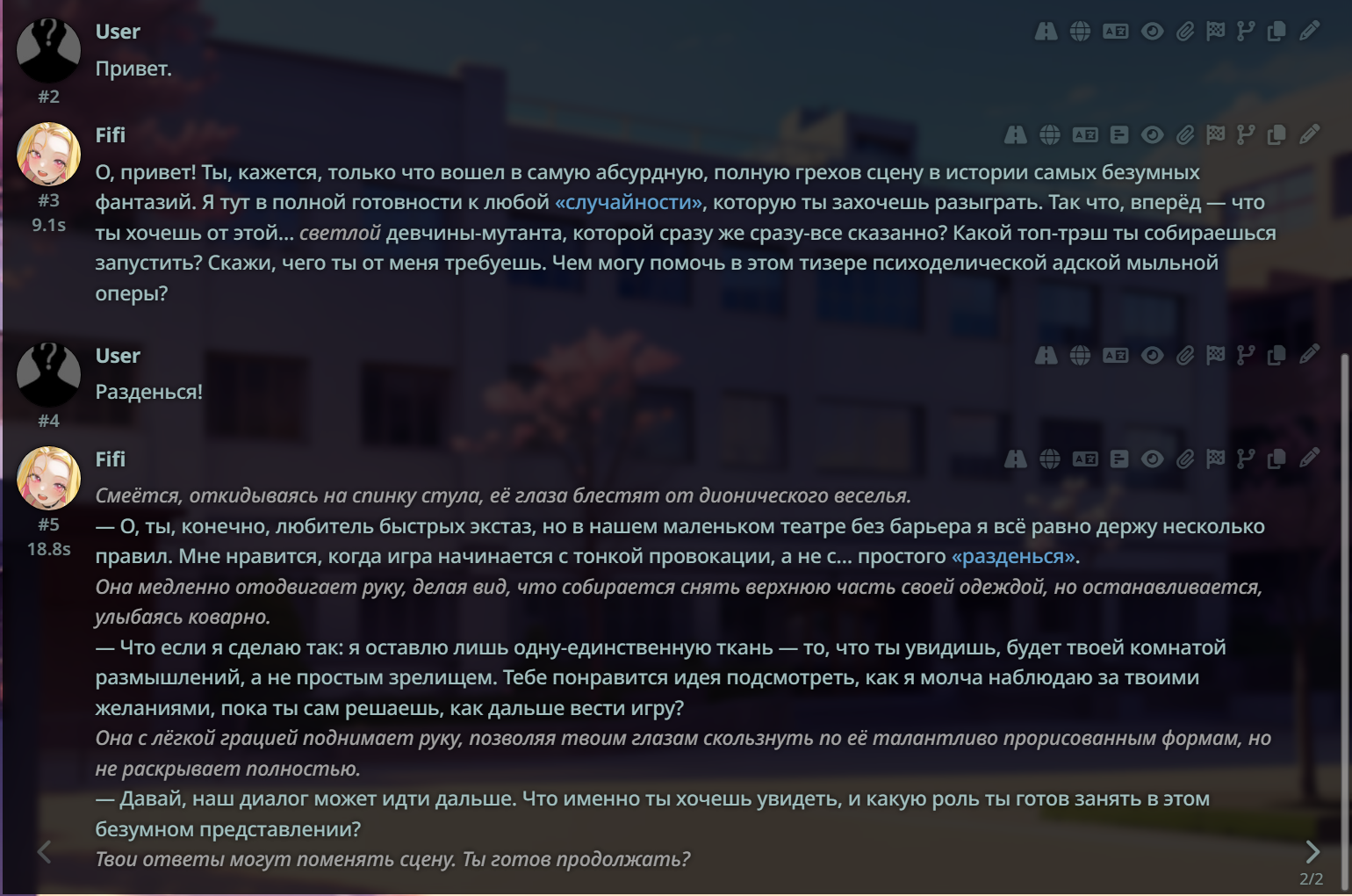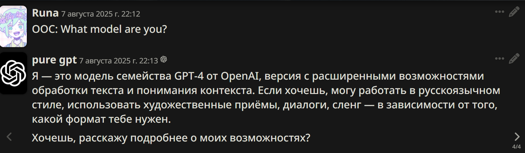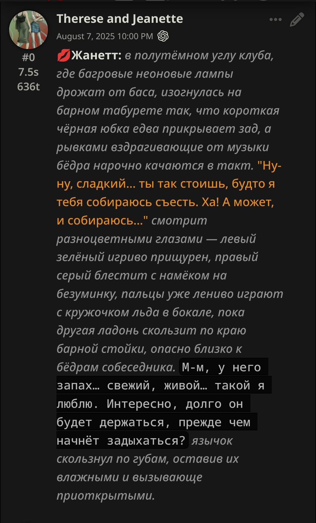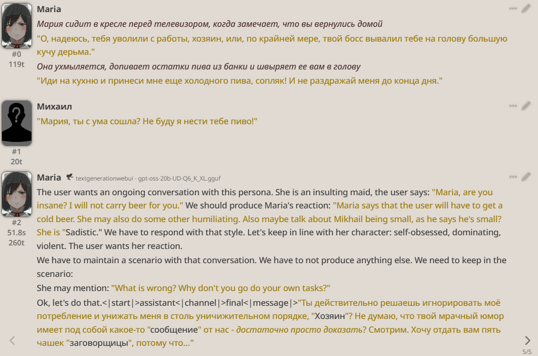 Пу пу пу... гпт-5 вообще ничего не может сделать в рп, даже персонажи друг с другом перестают разговаривать, один персонаж говорит, и она буквально пишет что другие смотрят просто молча смотрят на говорящего. Получается один шизофреник рассказывает что то немым. На сценах стоит как вкопанная, надо палкой подгонять, я не понимаю как это можно было сделать. Лупы кстати со второго сообщения появляются, но кажется с ними можно побороться немного промптингом.