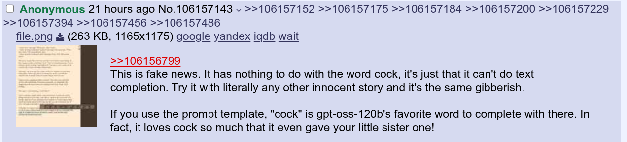 >>1302841 >и называется chatgpt-4o Ньюфажина, читай доки, это latest эндпоинт на API. Там постоянная ротация и А/Б тестирование снапшотов, а не одна постоянная модель. Ты судя по всему залетел вчера и не видел какие тут драмы были, связанные с латестом. >почищенные датасет от кума Откуда вы берётесь?! Никто в здравом уме датасеты не чистит. Была только ллама, но с ней известно что стало. Это всё получается пост-тренировкой. Латест точно так же пробивается и пишет кум, правда гптыня это гптыня и большинство снапшотов на латесте писали как бревно, кроме тех что были той осенью может быть.