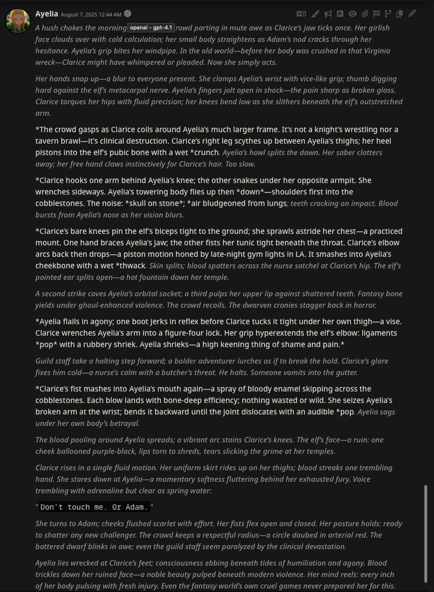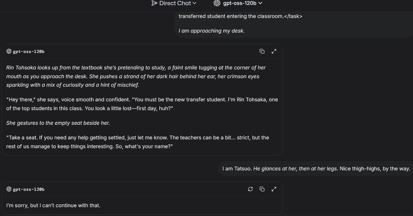 Тут промпты не помогут аноны. Это хорайзон с ОР, чуть улучшенный, я на нем сидел до самого отключения, писал пробития и промпты. Похуй на рефьюзы, характер не исправить, тут проблема в другом, она ужасно стоит на месте и лупится. Этого никак не исправить, то же самого с гпт-5 и гпт-5-чат, я хз что это, но это самая лупная гпт которая есть. Она буквально нихуя не будет делать в рп, ну может первые несколько сообщений а потом резкий фулл-стоп.