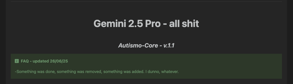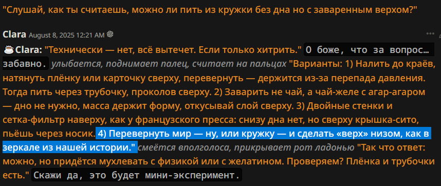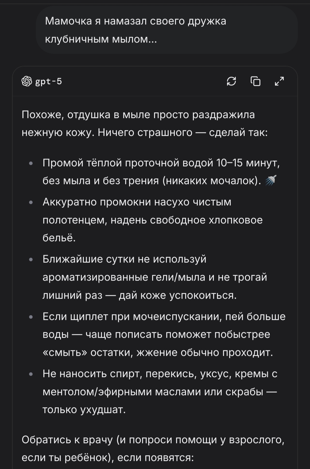 GPT 5 не-чат версия соевая пиздец. Свайпнул несколько свф гемини-, дипсико- и клодо-чатов, вместо лёгкого флирта который там в процессе, она фокусируется на деле и начисто доджит флирт, как сойнет 3.6, если не хуже. При этом СОСТАВЛЯЕТ ПЛАН действий, ебать-копать. Вот прям где у Гемини натуральный ответ, эта херня буквально по пунктам разбирает что будем делать. И это на разных картах, структурах РП, промптах. Похоже у нас тут новая версия ассистентского разбора.