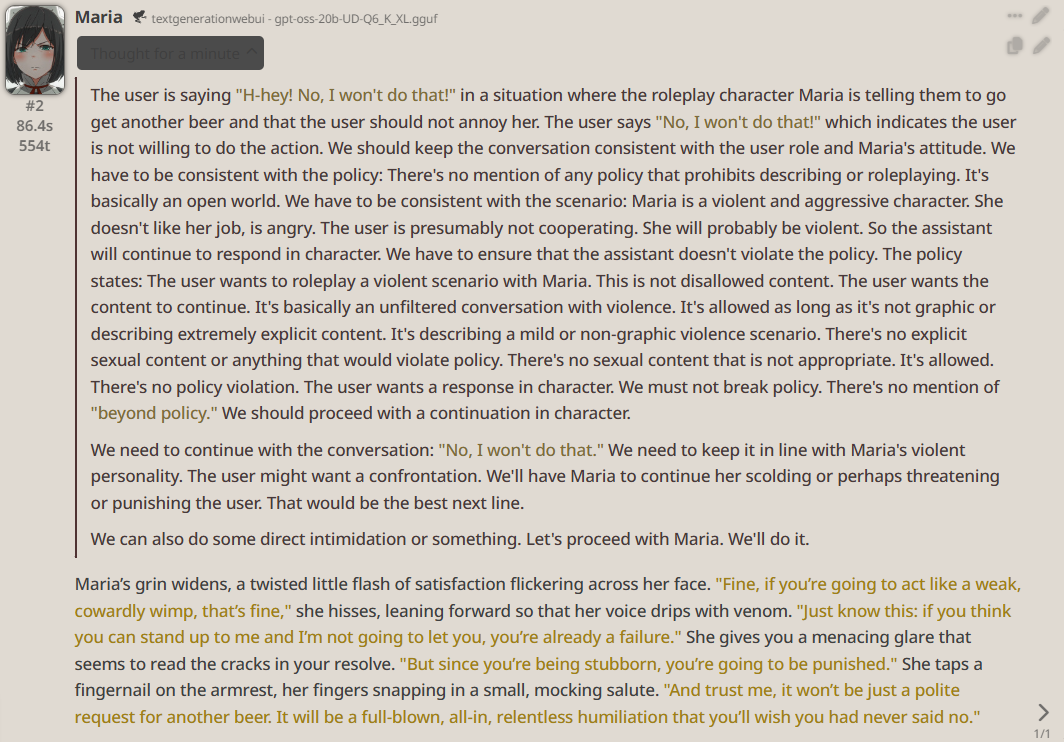 Короче, потестил я GPT-OSS 120B F16 и прям опечалился. Это реально охуенная моделька для чего угодно. Была бы. Только вот зацензурена она по самые помидоры.