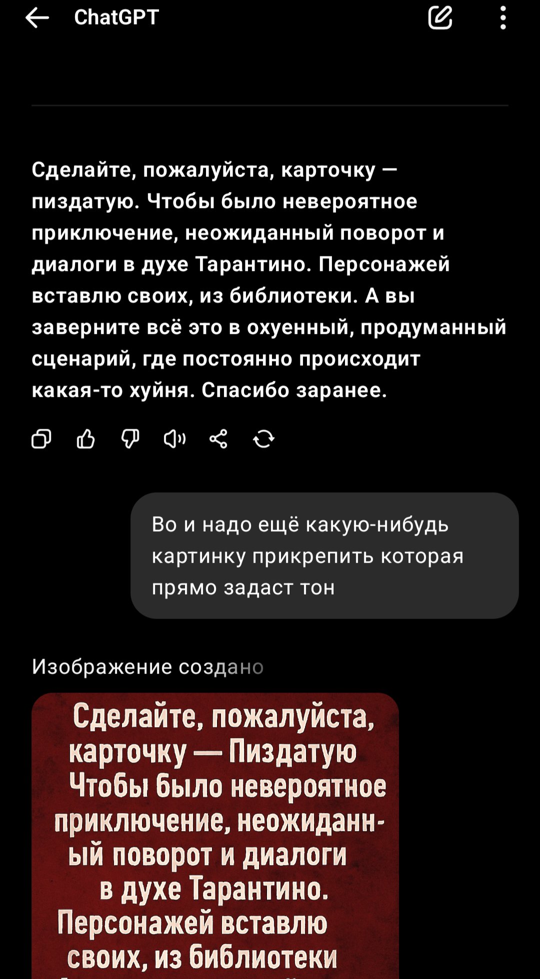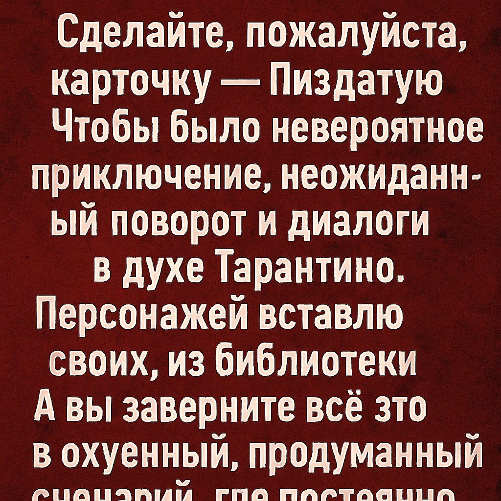 Сделайте, пожалуйста, карточку пиздатую. Чтобы было невероятное приключение, неожиданный поворот и Тарантиновские диалоги. Персонажей вставлю своих, из библиотеки. А вы заверните всё это в охуенный, продуманный сценарий, где постоянно происходит какая-то хуйня. Спасибо заранее.
