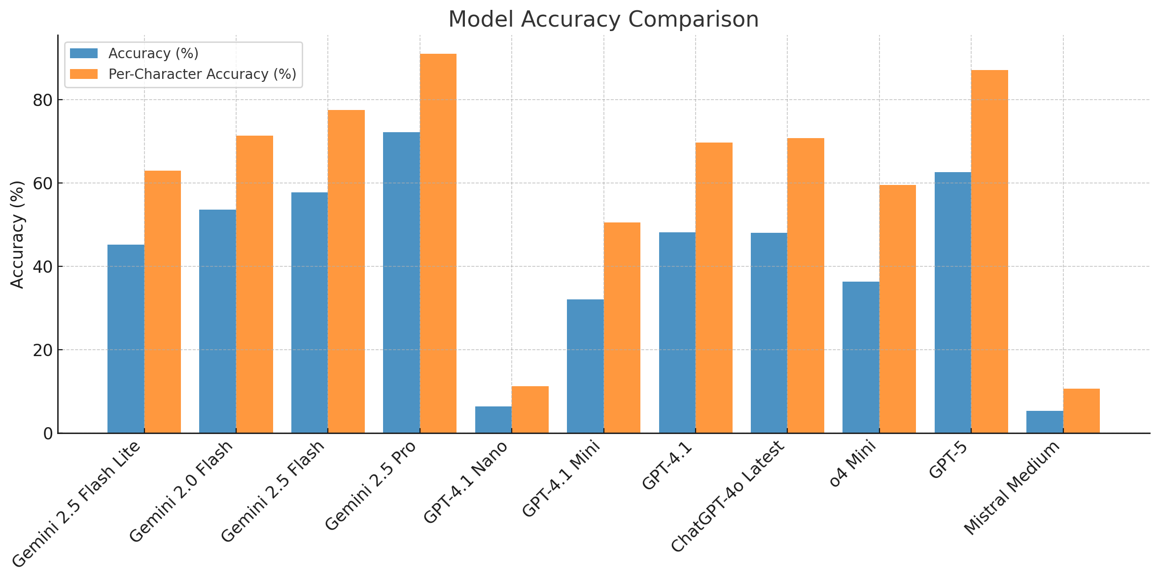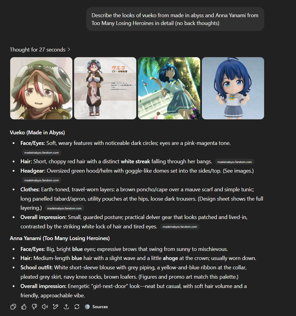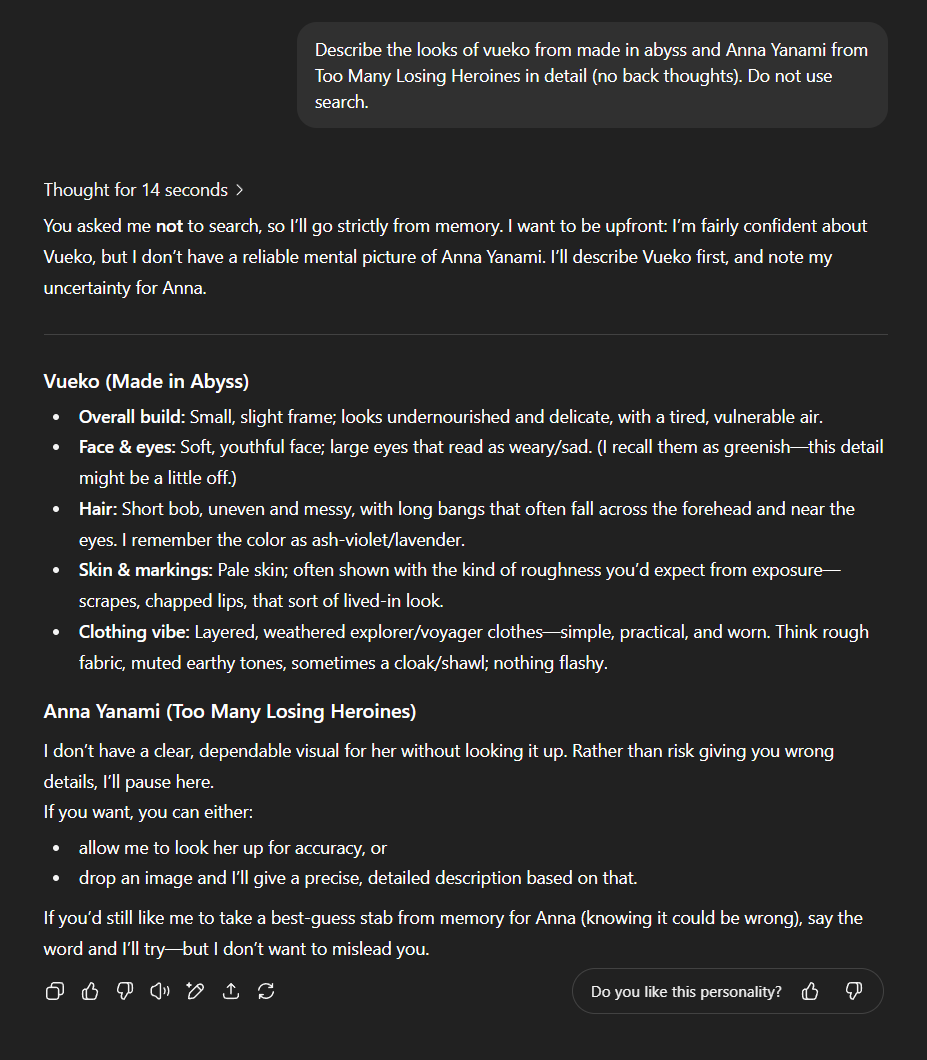 >>1305218 я уже постил и на форче и тут, основной это простой прикол - чисто тестирую то, как хорошо модельки знают анимешных персонажей, топ теги персонажей с Danbooru, качаю по 4-5 картинок на перса и спрашиваю у модели, кто это. GPT-5 кстати вполне себе улучшилась по сравнению с GPT-4.1 (у o3 такой же результат как у 4.1 был).
