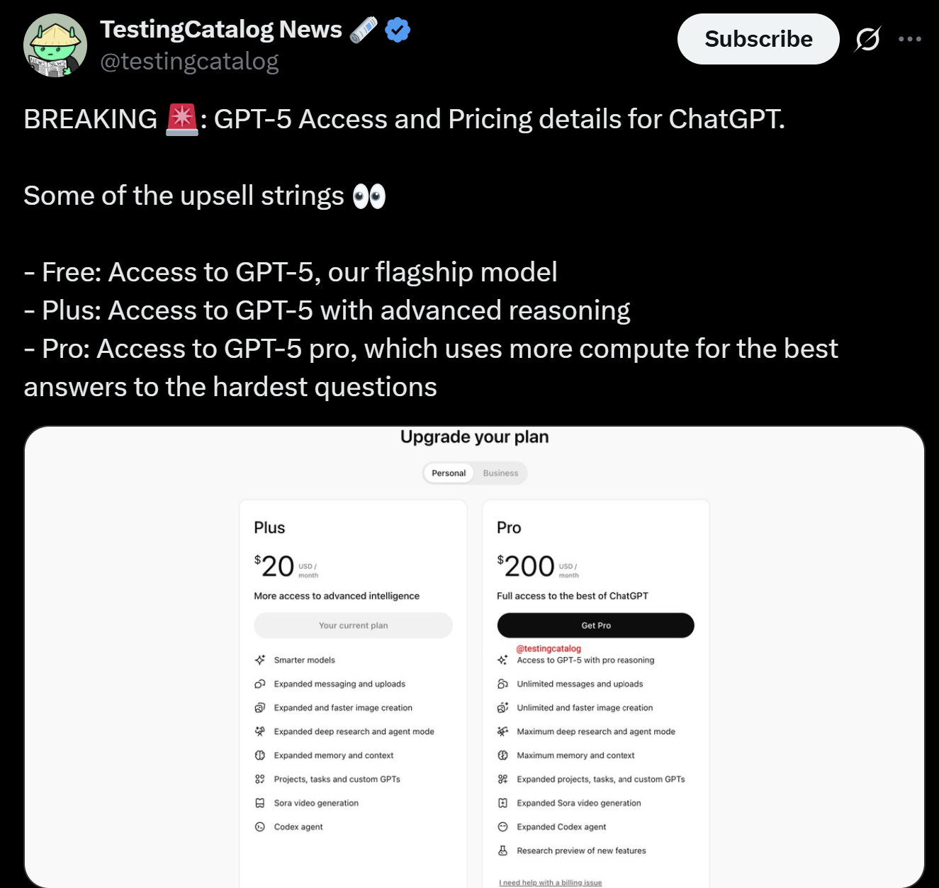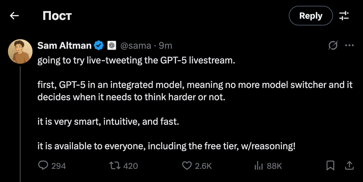 Сегодня выходит для пользователей Free, Plus, Pro и Team. На следующей неделе - для Enterprise и Education. Пользователи Pro получают GPT-5 Pro.