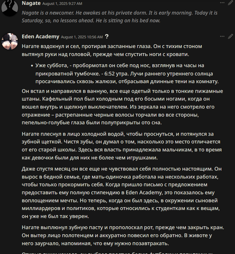 До тех пор пока не натыкаешься на цензуру всё прям очень хорошо. Эта модель НИ РАЗУ не пыталась ответить за меня в рп, или продолжить мои действия. В ней нет стандартных заебавших оборотов, которые выдаёт каждая вторая модель из существующих если не каждая первая. Она практически не забывает произошедшие события.