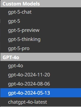 дауны)) это гпт чат латест ЛАТЕСТ это значит что её будут постоянно менять это не статичный снапшот, через пару дней гайки закрутят и они втихую убьют кум накинут миллиард фильтров. сейчас просто идет сбор логов для сейфти команды индусов как с гпт 4.5
