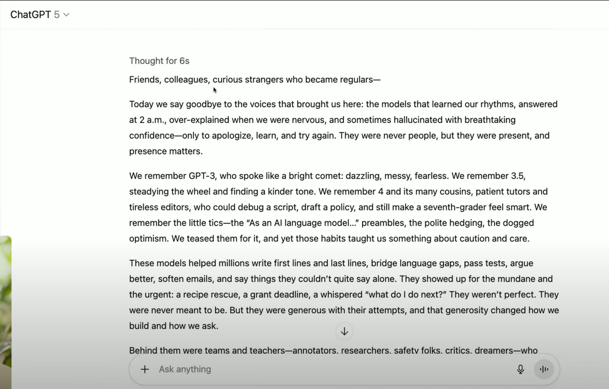 5чат это неюзабельная залупа, сомневаюсь что кто-то будет по этому скучать. 5 обычная ощущается скорее как новая сетка из о-серии, там и без цензуры безнадега в плане рп. это просто сетки аутисты, которые хотят генерить кодик и таблички, а не разговаривать с юзером