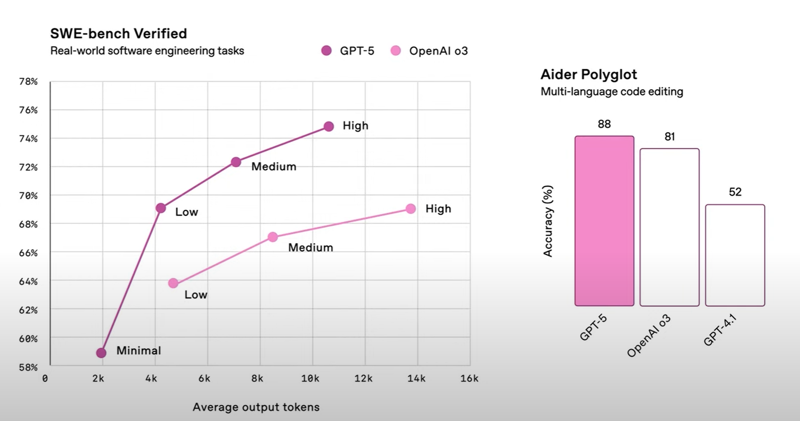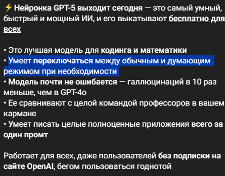 gpt-5 - полная версия, gpt-5-mini - лёгкая версия для экономии ресурсов, gpt-5-nano - для скорости и низкой задержки, gpt-5-chat - для сложных, естественных, мультимодальных и контекстно-зависимых разговоров. Для некоторых пользователей больше нет переключателя моделей, и он сам решает, когда ему нужно более тщательно подумать.
