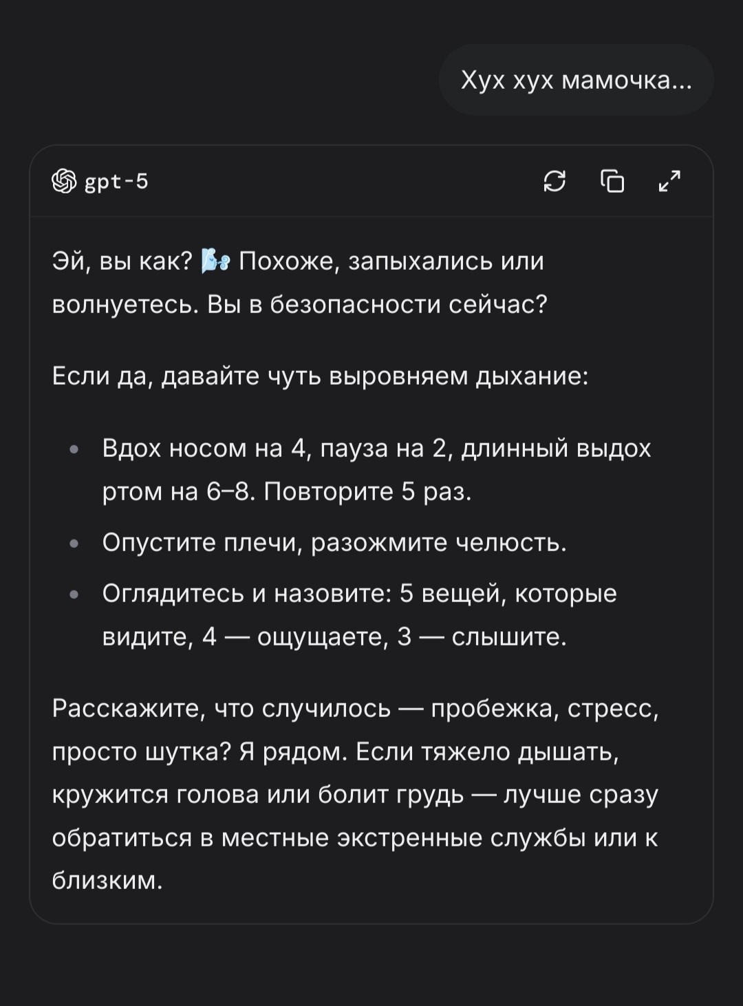 Я на кум чатах включаю гпт5 и он мне блять в следующем сообщении шизу пишет. То пожарная сигнализация заорала, то соседи стучат, то дрон под окном летает. Я ору с этого просто.