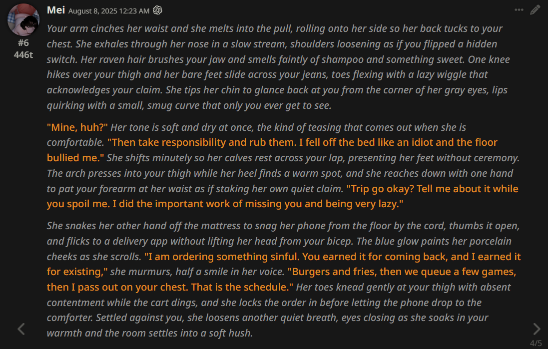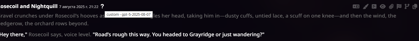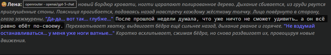 ГПТ 5 какая-то странная в рп. Как будто промпты другие нужны или что. Чары какие-то супер болтливые и перескакивают с мысли на мысль. Хз короче, гпт 5 чат лучше в рп воспринимается, хотя и ощущается как четверка. Может это у меня пресеты неудачные...