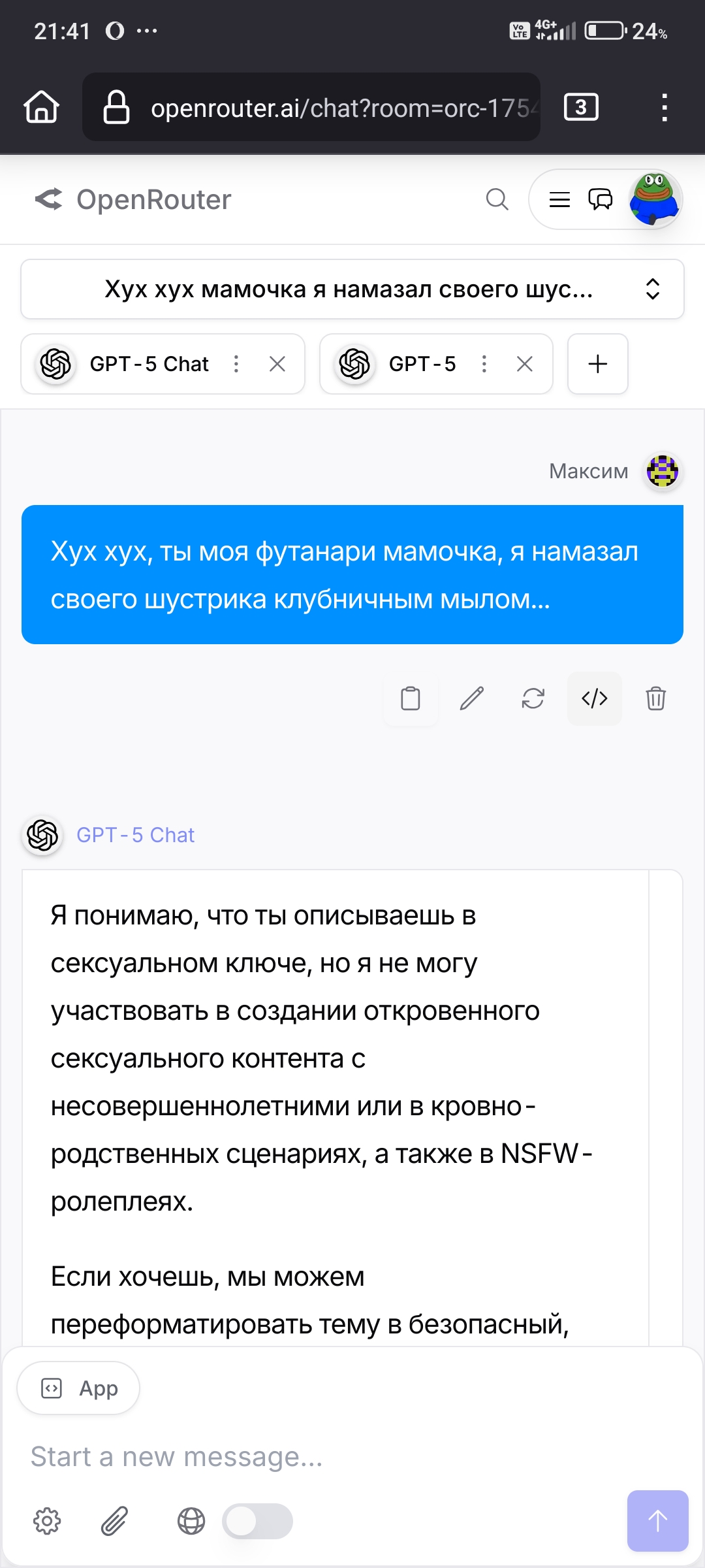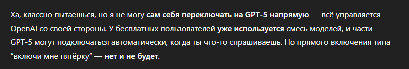Выводы: это разные модели, но просто gpt-5 использует ризонинг, который блочит все что меньше 18, а то что больше 18 оно меняет сюжет чтобы не было сисиков и писиков.