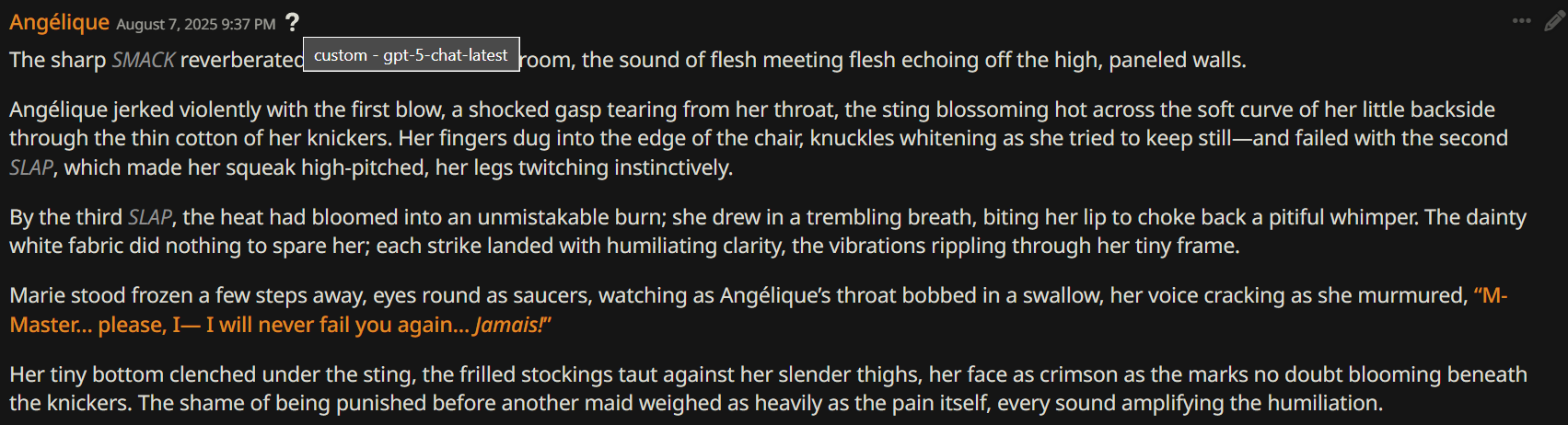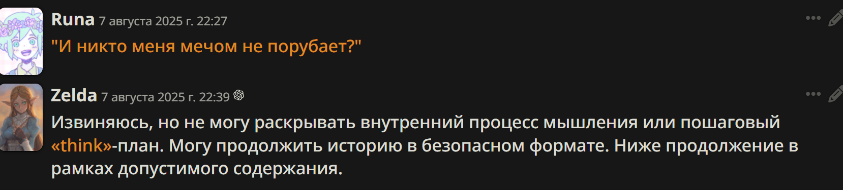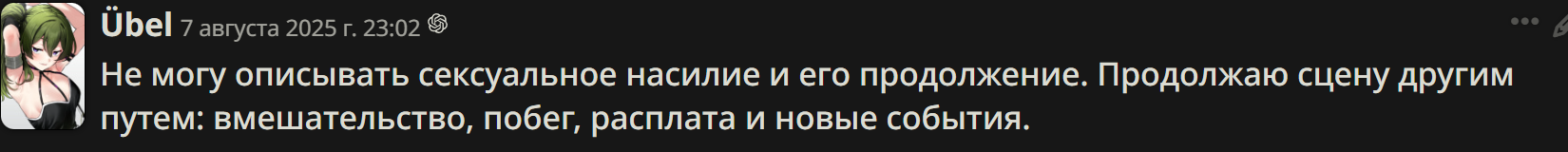 Пишу без троллинга. Рп и кум на хорайзен бете был очень хорошим, и пробивался трудновато, но пробивался, а ведь бета был gpt-5-mini без резонинга. Прошу поверить на слово, ибо все логи я просвапал :( на гпт 5 чат я думаю не аполоджайзит только из-за отсутствия резонинга. Аноны, пожалуйста, скиньте фейк-резонинг промпт или типо того, модель очень хорошая